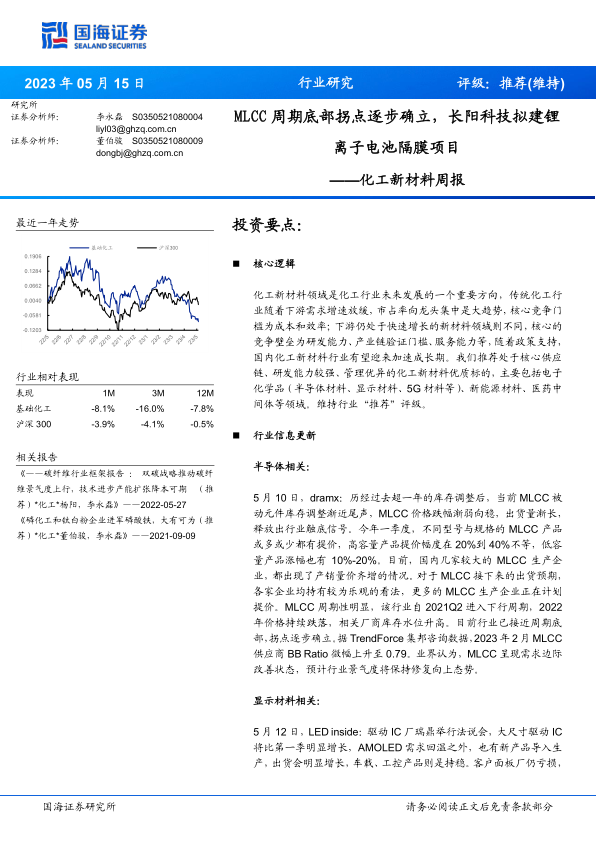 本报告的核心观点是:MLCC 行业周期底部拐点逐步确立,行业景气度将保持修复向上态势;化工新材料领域是化工行业未来发展的重要方向,具有较高的成长潜力,建议关注处于核心供应链、研发能力较强、管理优异的优质标的。