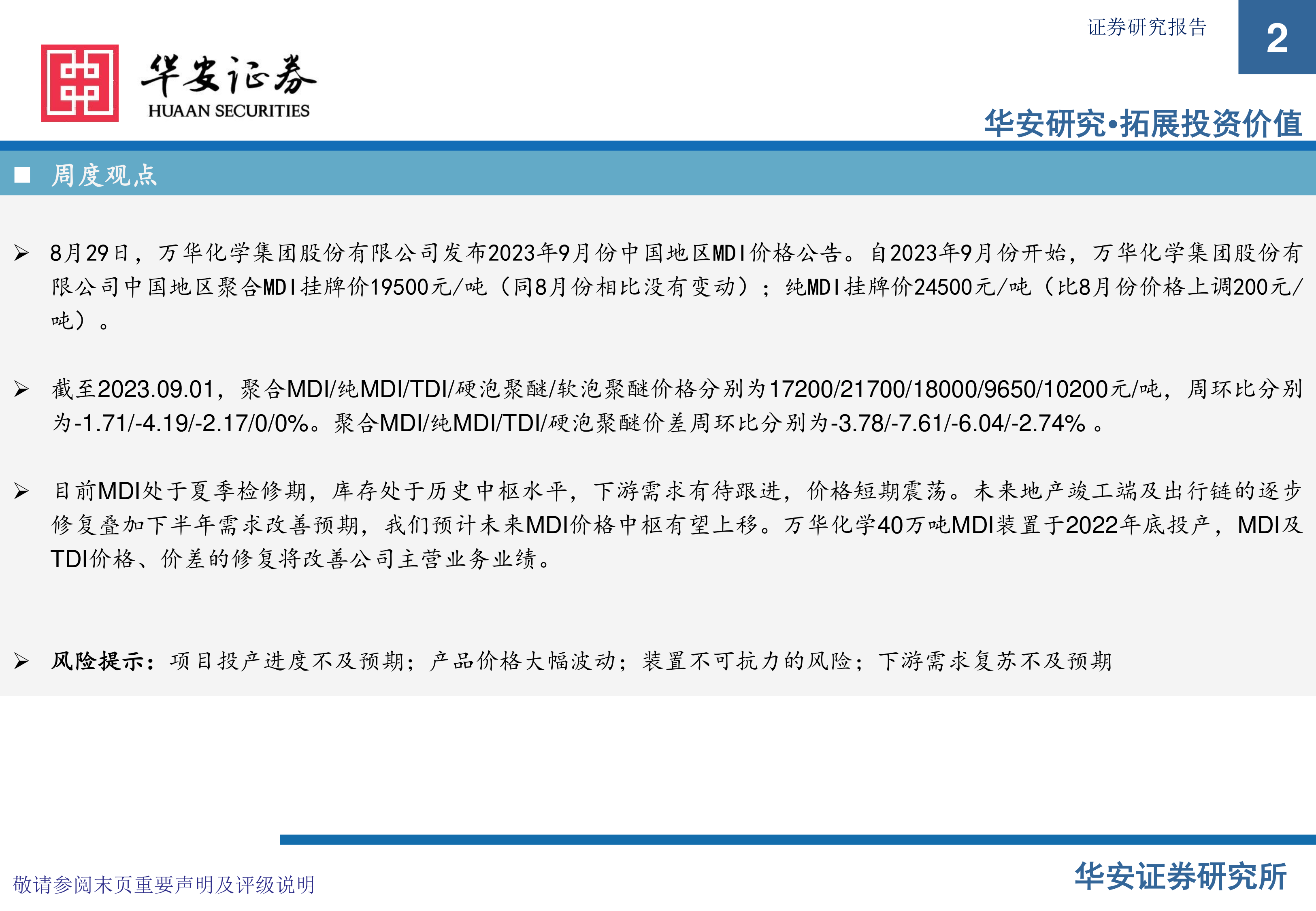 本报告的核心观点是:万华化学9月份纯MDI挂牌价上调,体现了MDI市场价格短期震荡,但长期向好趋势不变。 主要基于以下几点: