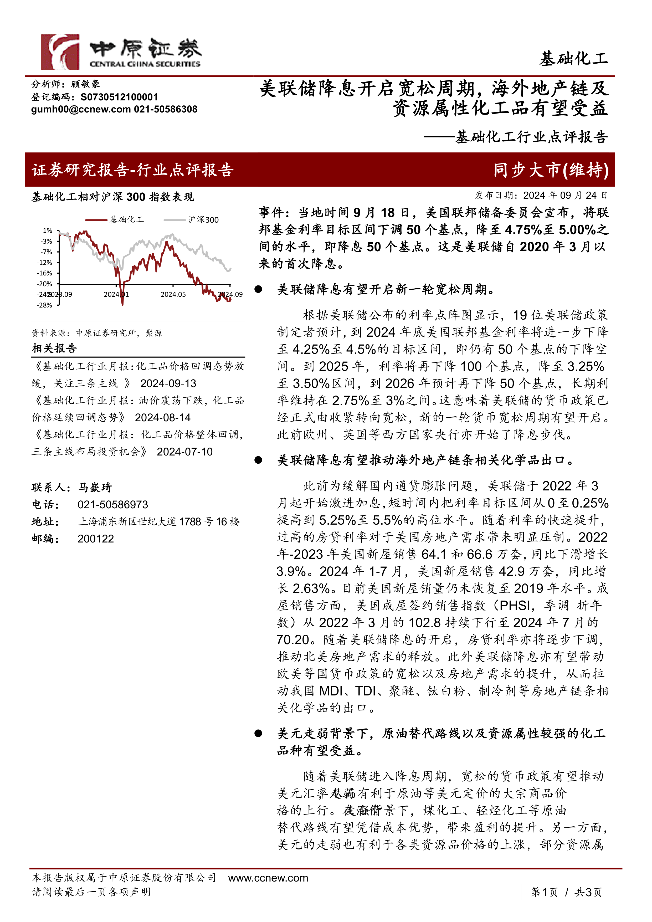 基础化工行业点评报告:美联储降息开启宽松周期,海外地产链及资源属性化工品有望受益