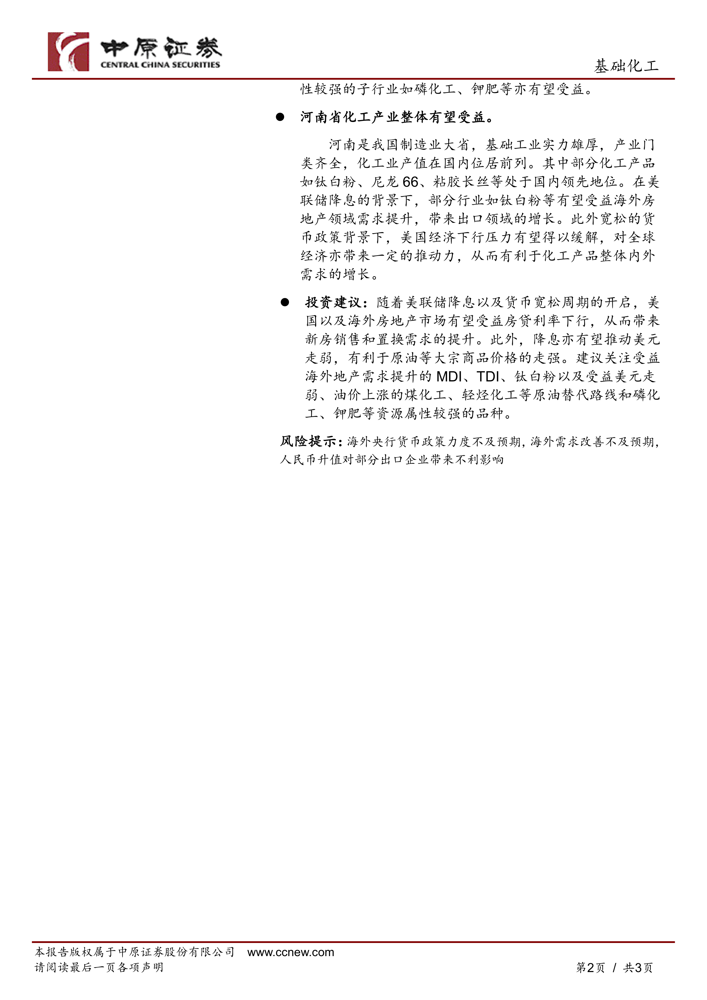 河南是我国制造业大省,基础工业实力雄厚,产业门类齐全,化工业产值在国内位居前列。其中部分化工产品如钛白粉、尼龙66、粘胶长丝等处于国内领先地位。在美联储降息的背景下,部分行业如钛白粉等有望受益海外房地产领域需求提升,带来出口领域的增长。此外宽松的货币政策背景下,美国经济下行压力有望得以缓解,对全球经济亦带来一定的推动力,从而有利于化工产品整体内外需求的增长。