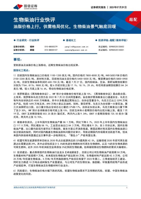 6)风险提示:生物柴油价格大幅下跌的风险,欧盟生物柴油需求不及预期的风险,欧盟、中国生物柴油政策变化的风险。