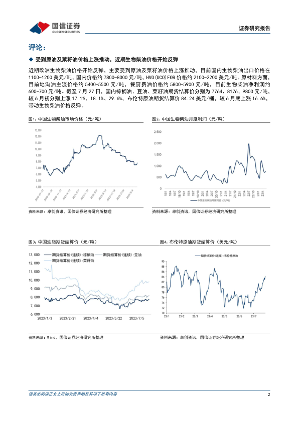 1)目前国内生物柴油出口价格在1100-1200美元/吨,国内价格约7800-8000元/吨,HVO(UCO)FOB价格约2100-2200美元/吨。原材料方面,目前地沟油主流价格约5400-5500元/吨,餐厨费油价格约5800-5900元/吨,目前生物柴油净利润约600-700元/吨。截至7月27日,国内棕榈油、豆油、菜籽油期货结算价分别为7764、8176、9800元/吨,较6月初分别上涨17.1%、18.1%、29.6%,布伦特原油期货结算价84.24美元/桶,较6月底上涨16.6%,带动生物柴油价格反弹。