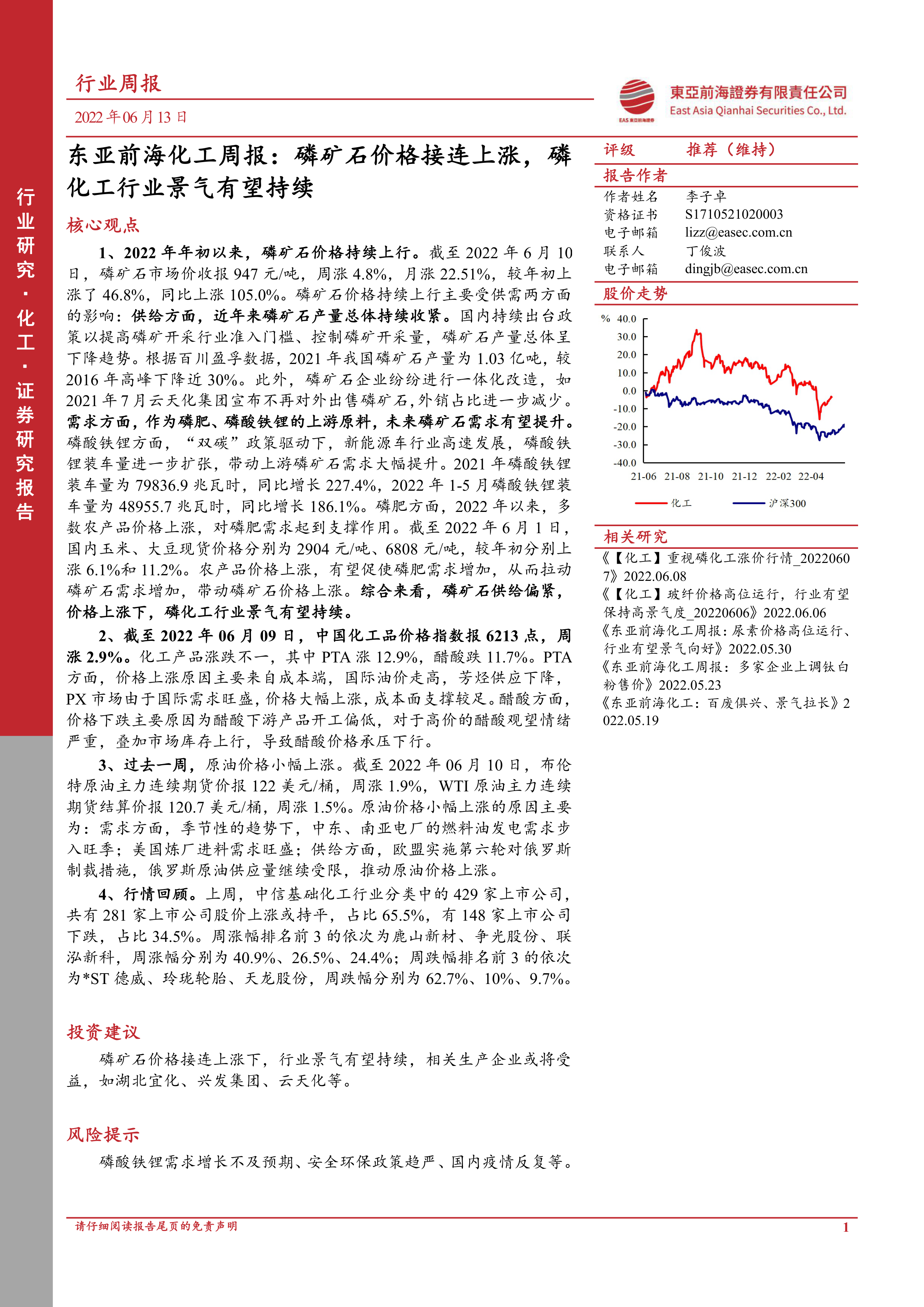 1、 2022 年年初以来, 磷矿石价格持续上行。 截至 2022 年 6 月 10日, 磷矿石市场价收报 947 元/吨, 周涨 4.8%, 月涨 22.51%, 较年初上涨了 46.8%, 同比上涨 105.0%。 磷矿石价格持续上行主要受供需两方面的影响: 供给方面, 近年来磷矿石产量总体持续收紧。 国内持续出台政策以提高磷矿开采行业准入门槛、 控制磷矿开采量, 磷矿石产量总体呈下降趋势。 根据百川盈孚数据, 2021 年我国磷矿石产量为 1.03 亿吨, 较2016 年高峰下降近 30%。 此外, 磷矿石企业纷纷进行一体化改造, 如2021 年 7 月云天化集团宣布不再对外出售磷矿石, 外销占比进一步减少。需求方面, 作为磷肥、 磷酸铁锂的上游原料, 未来磷矿石需求有望提升。磷酸铁锂方面, “双碳” 政策驱动下, 新能源车行业高速发展, 磷酸铁锂装车量进一步扩张, 带动上游磷矿石需求大幅提升。 2021 年磷酸铁锂装车量为 79836.9 兆瓦时, 同比增长 227.4%, 2022 年 1-5 月磷酸铁锂装车量为 48955.7 兆瓦时, 同比增长 186.1%。 磷肥方面, 2022 年以来, 多数农产品价格上涨, 对磷肥需求起到支撑作用。 截至 2022 年 6 月 1 日,国内玉米、 大豆现货价格分别为 2904 元/吨、 6808 元/吨, 较年初分别上涨 6.1%和 11.2%。 农产品价格上涨, 有望促使磷肥需求增加, 从而拉动磷矿石需求增加, 带动磷矿石价格上涨。 综合来看, 磷矿石供给偏紧,价格上涨下, 磷化工行业景气有望持续。