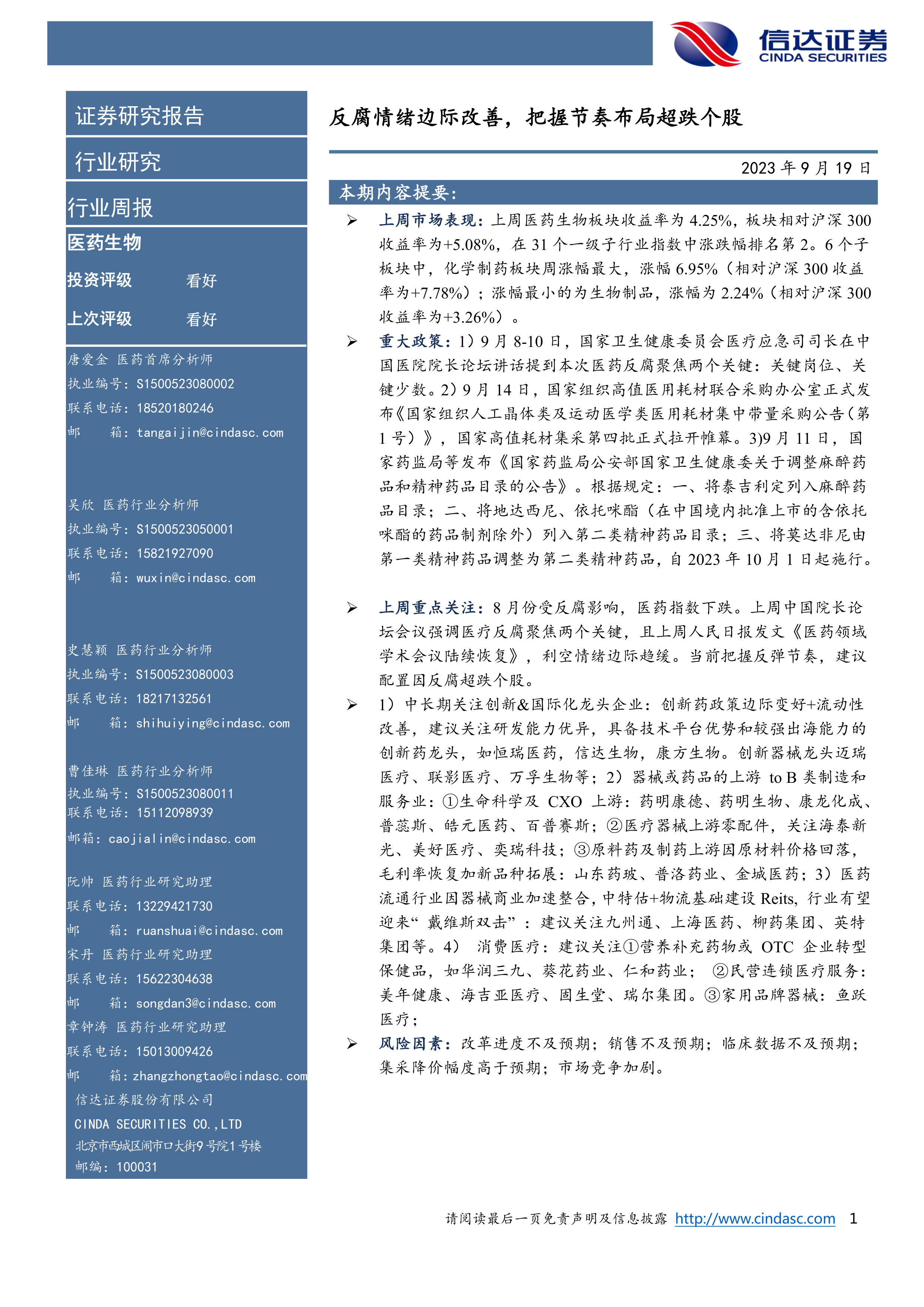 重大政策:1)9月8-10日,国家卫生健康委员会医疗应急司司长在中国医院院长论坛讲话提到本次医药反腐聚焦两个关键:关键岗位、关键少数。2)9月14日,国家组织高值医用耗材联合采购办公室正式发布《国家组织人工晶体类及运动医学类医用耗材集中带量采购公告(第1号)》,国家高值耗材集采第四批正式拉开帷幕。3)9月11日,国家药监局等发布《国家药监局公安部国家卫生健康委关于调整麻醉药品和精神药品目录的公告》。根据规定:一、将泰吉利定列入麻醉药品目录;二、将地达西尼、依托咪酯(在中国境内批准上市的含依托咪酯的药品制剂除外)列入第二类精神药品目录;三、将莫达非尼由第一类精神药品调整为第二类精神药品,自2023年10月1日起施行。