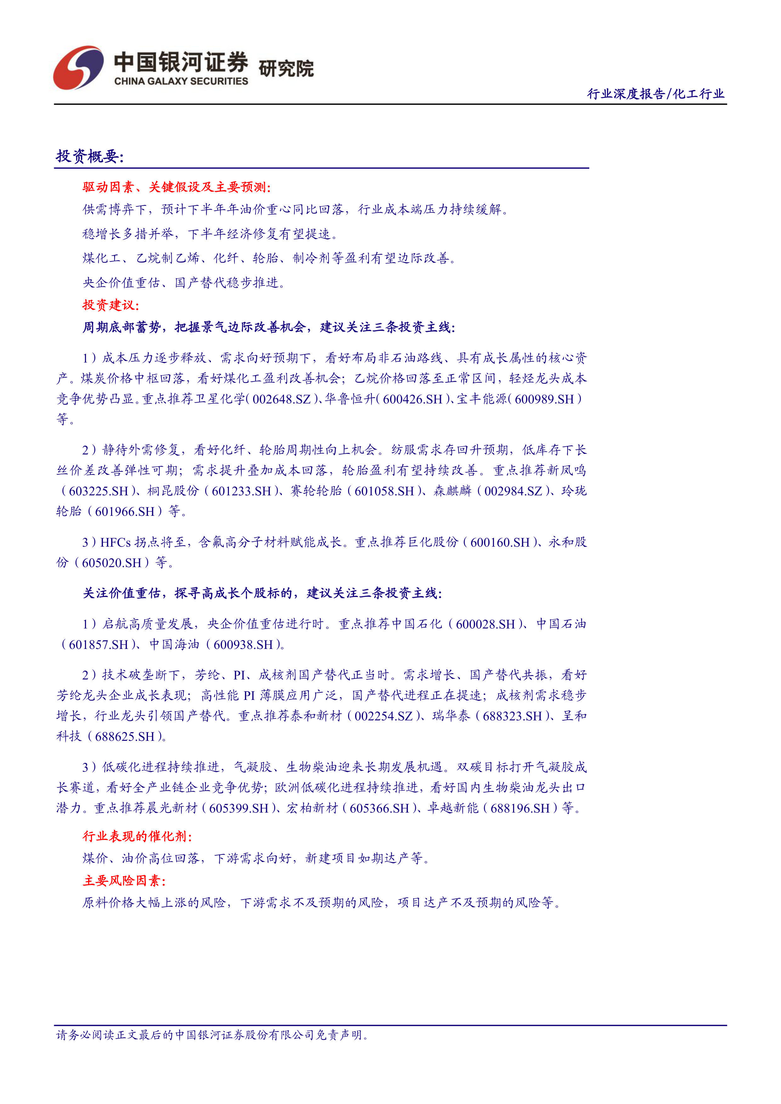 周期底部蓄势,把握景气边际改善机会 成本压力逐步释放、需求向好预期下,看好布局非石油路线、具有成长属性的核心资产;重点推荐卫星化学(002648.SZ)、 华鲁恒升(600426.SH)、宝丰能源(600989.SH)等。静待外需修复,看好化纤、轮胎周期性向上机会;重点推荐新凤鸣(603225.SH)、桐昆股份(601233.SH)、赛轮轮胎(601058.SH)、森麒麟(002984.SZ)、玲珑轮胎(601966.SH)等。 HFCs 拐点将至,含氟高分子材料赋能成长; 重点推荐巨化股份(600160.SH)、永和股份(605020.SH)等。