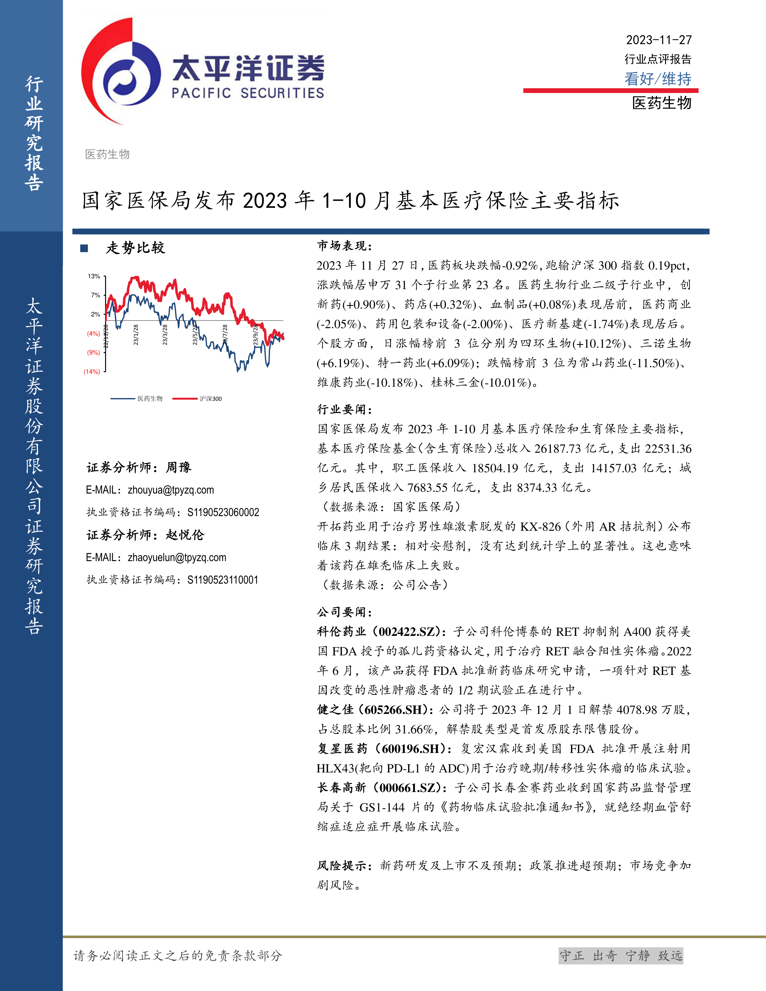 本报告对2023年11月27日医药板块的市场表现进行了分析,并结合国家医保局数据和几家医药公司的动态,对行业发展趋势进行了初步判断。医药板块整体表现弱于大盘,但个股表现分化明显,部分创新药研发取得进展,但也存在新药研发失败的风险。投资者需密切关注国家政策、行业竞争以及公司自身发展情况,谨慎投资。 医保基金收支情况以及大量股份解禁等因素都需纳入投资决策考量。 未来医药行业发展仍需关注创新药研发进展、医保政策调整以及市场竞争格局变化。