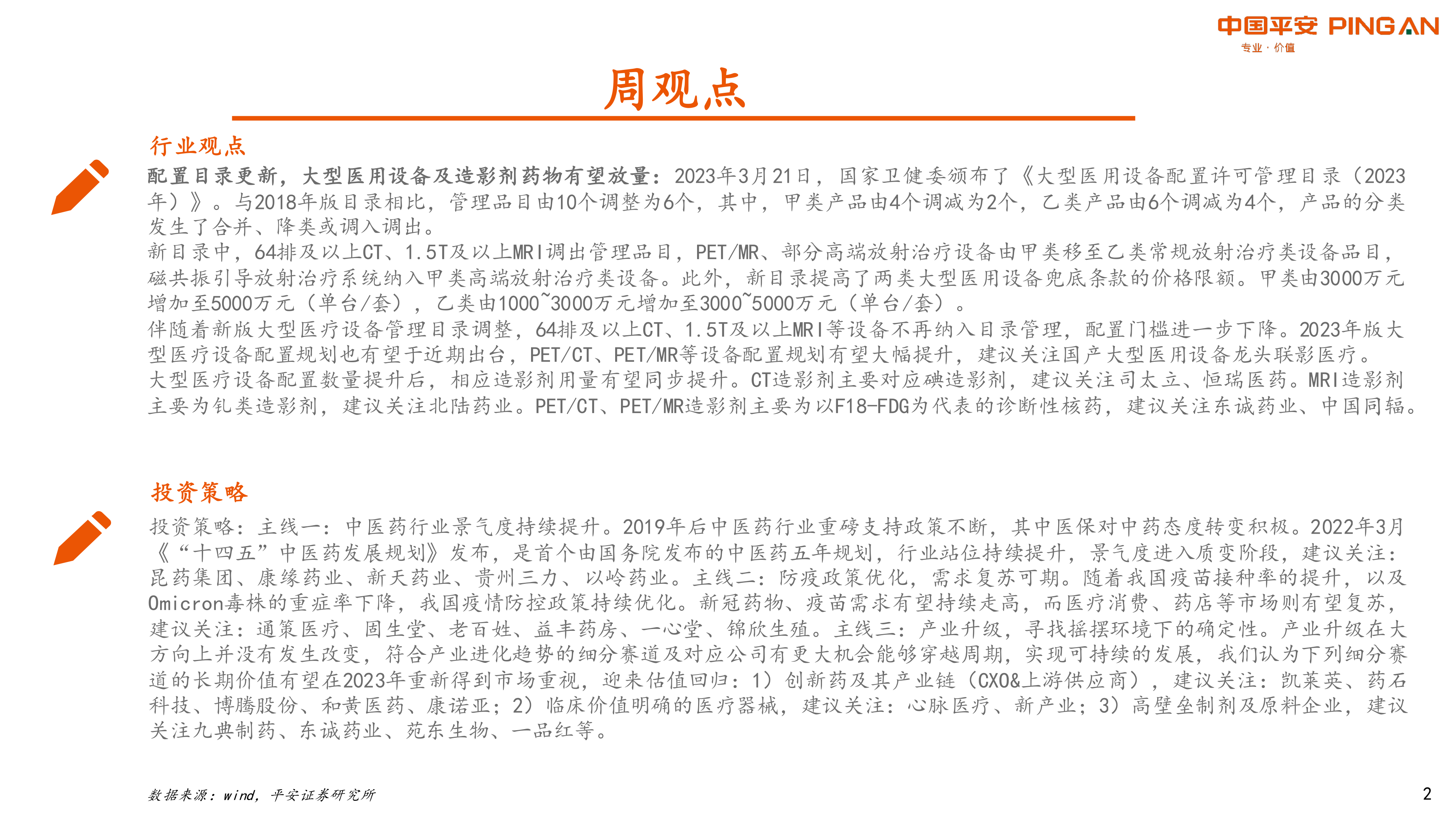 本报告的核心观点是:2023年版《大型医用设备配置许可管理目录》的调整,将推动大型医用设备及相关造影剂药物的放量增长。具体而言,新目录取消了对64排及以上CT、1.5T及以上MRI的配置限制,降低了配置门槛,并提高了设备价格限额。同时,PET/CT、PET/MR等设备的配置规划有望大幅提升。这将直接利好国产大型医用设备龙头企业和相关造影剂生产企业。报告建议关注联影医疗、司太立、恒瑞医药、北陆药业、东诚药业和中国同辐等公司。此外,报告还分析了中医药行业、防疫政策优化后的市场复苏以及产业升级带来的投资机会。