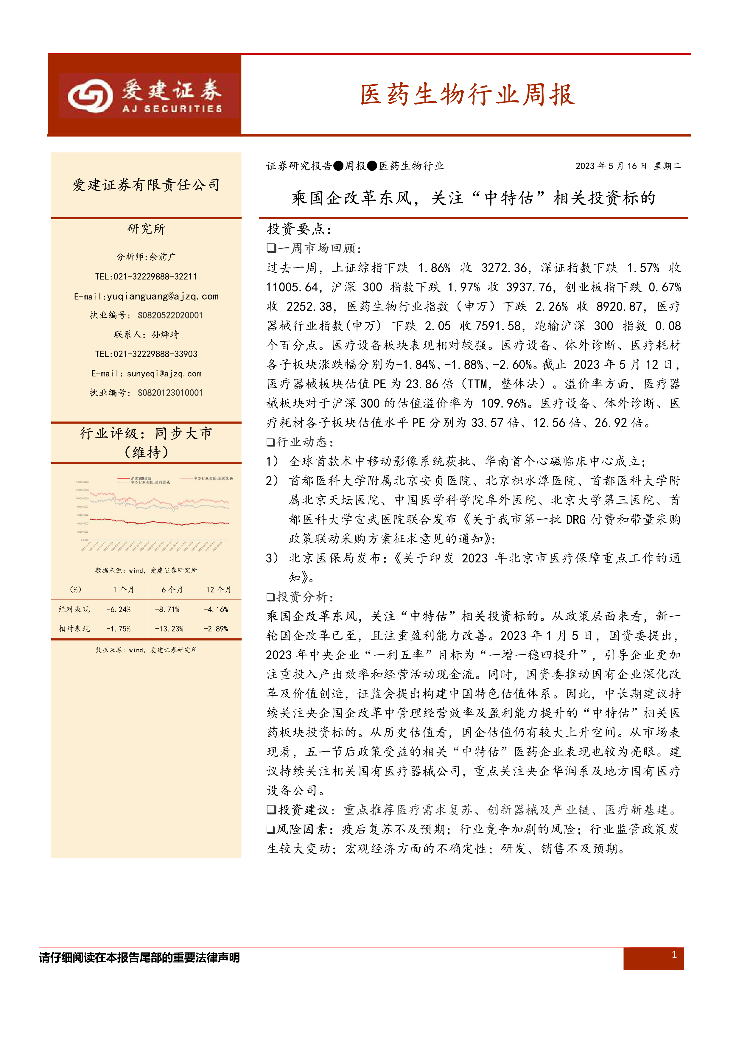 本报告对医药生物行业,特别是医疗器械板块的近期市场表现、估值水平和行业动态进行了全面分析。报告指出,在国企改革和“中特估”政策的背景下,国有医疗器械公司,特别是央企华润系及地方国有医疗设备公司,具有较大的投资价值。报告还分析了医疗器械各子板块的表现和估值,并提供了多家上市公司的重要公告信息和行业要闻,为投资者提供了较为全面的信息和参考,并最终给出了具体的投资建议。 然而,报告也指出了潜在的风险因素,例如疫后复苏不及预期、行业竞争加剧、政策变动以及宏观经济的不确定性等,投资者需谨慎考虑。