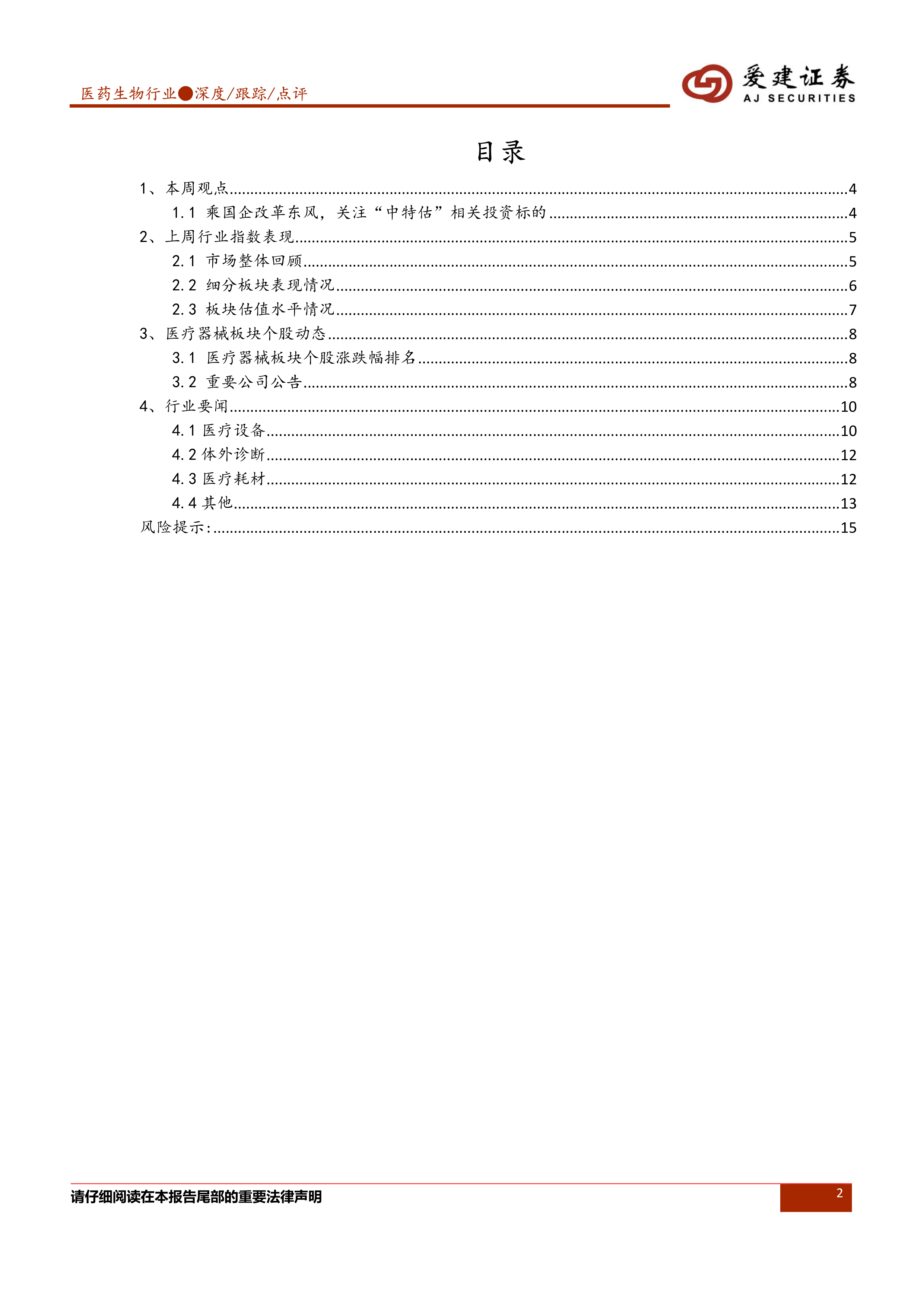 本报告的核心观点是:在国企改革持续推进,以及构建中国特色估值体系的背景下,建议投资者关注“中特估”相关医药板块投资标的,特别是央企华润系及地方国有医疗设备公司。报告同时分析了医药生物行业,特别是医疗器械板块的市场表现、估值水平以及行业动态,并对未来投资方向提出了建议。