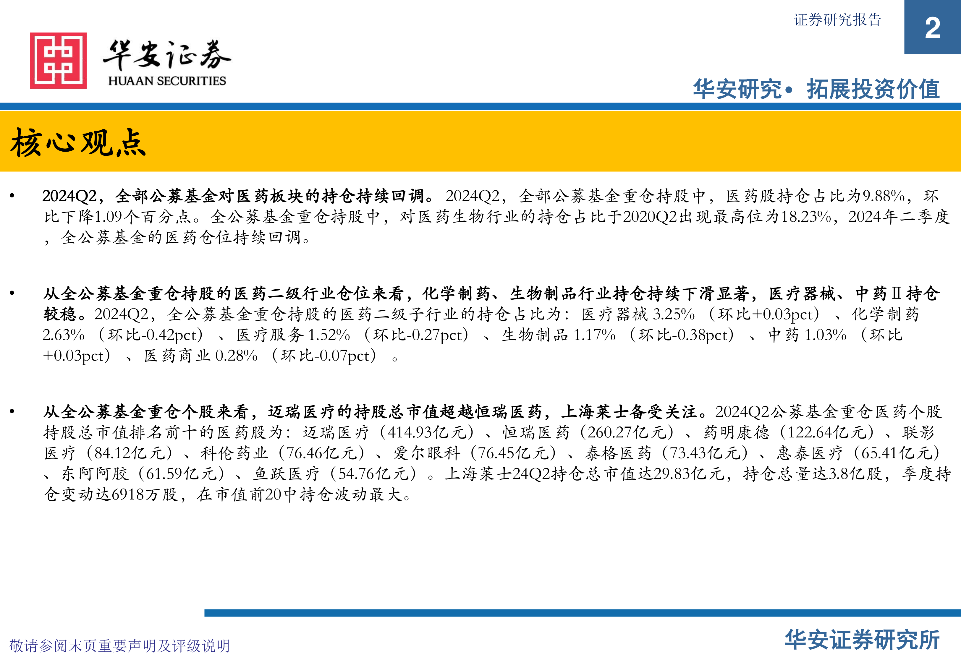 公募基金医药板块2024Q2持仓分析:2024Q2医药持仓持续回调,化学制药仓位下滑