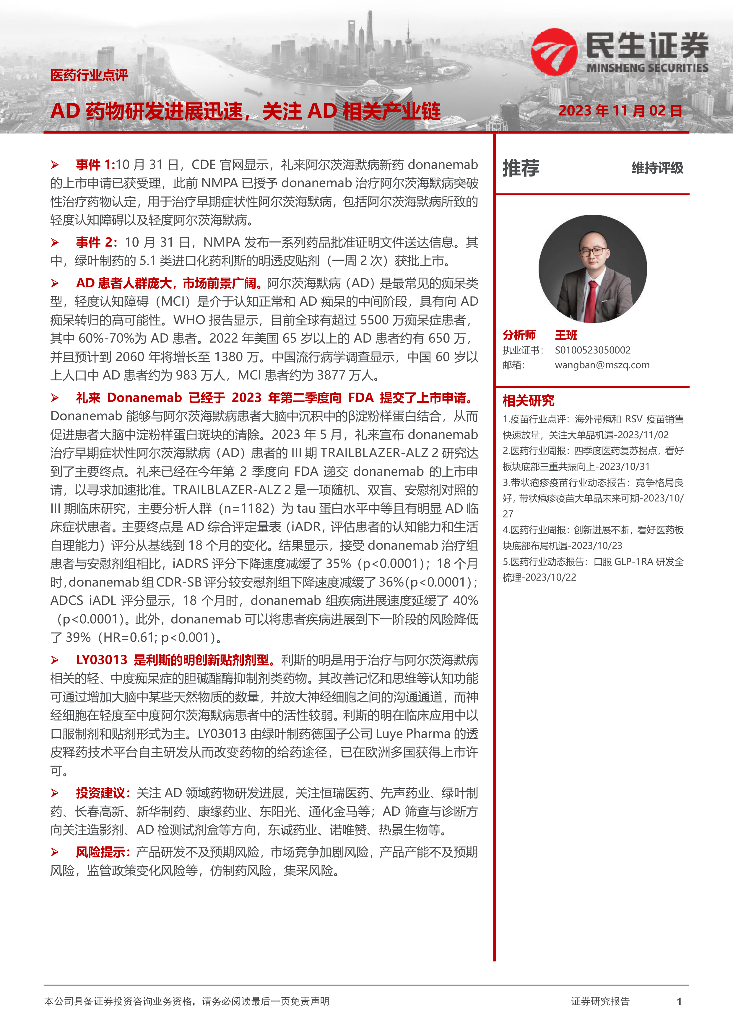 医药行业点评:AD药物研发进展迅速,关注AD相关产业链
