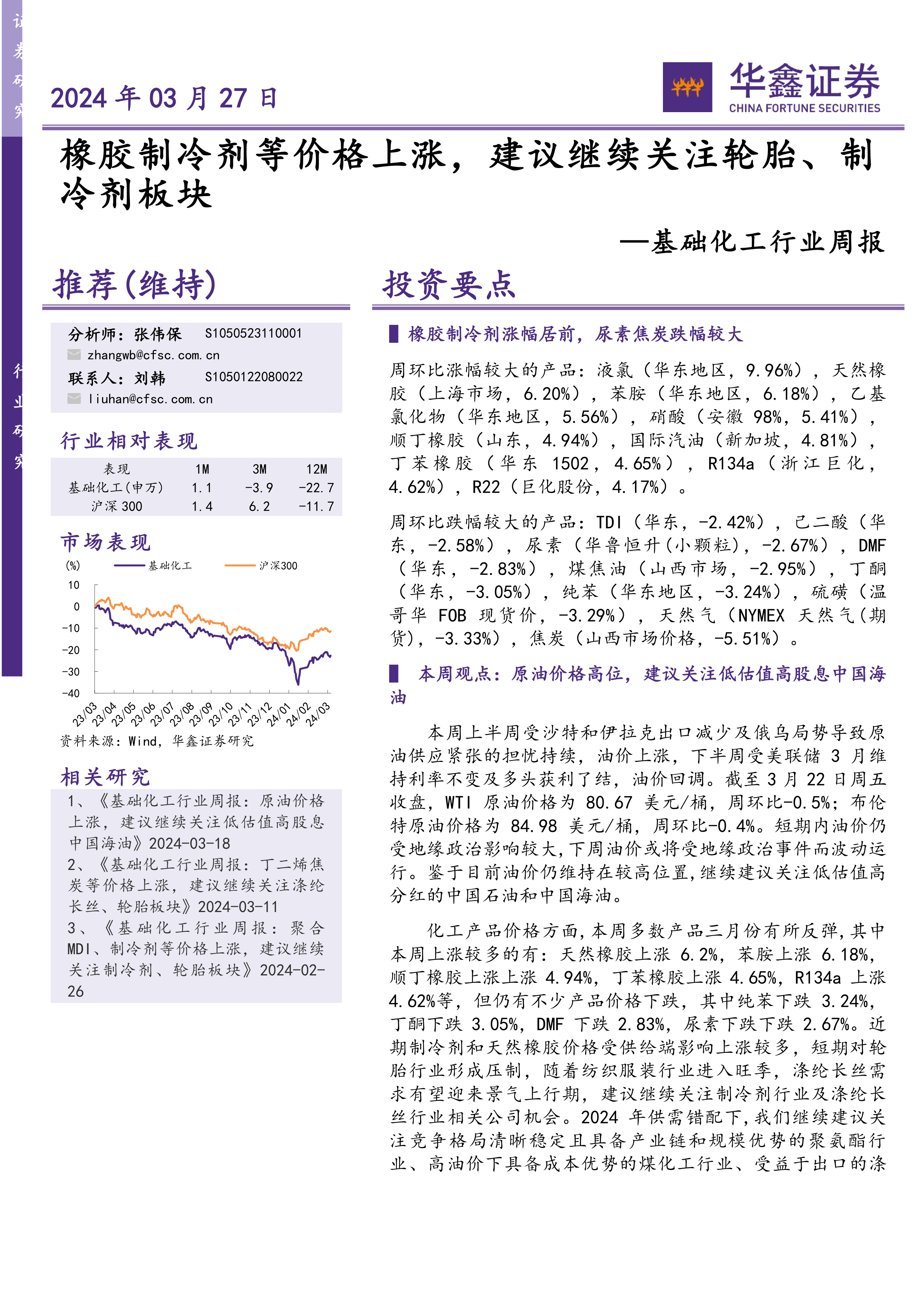 本报告详细分析了基础化工行业本周的市场表现,涵盖了行业跟踪、个股跟踪以及投资组合等方面。