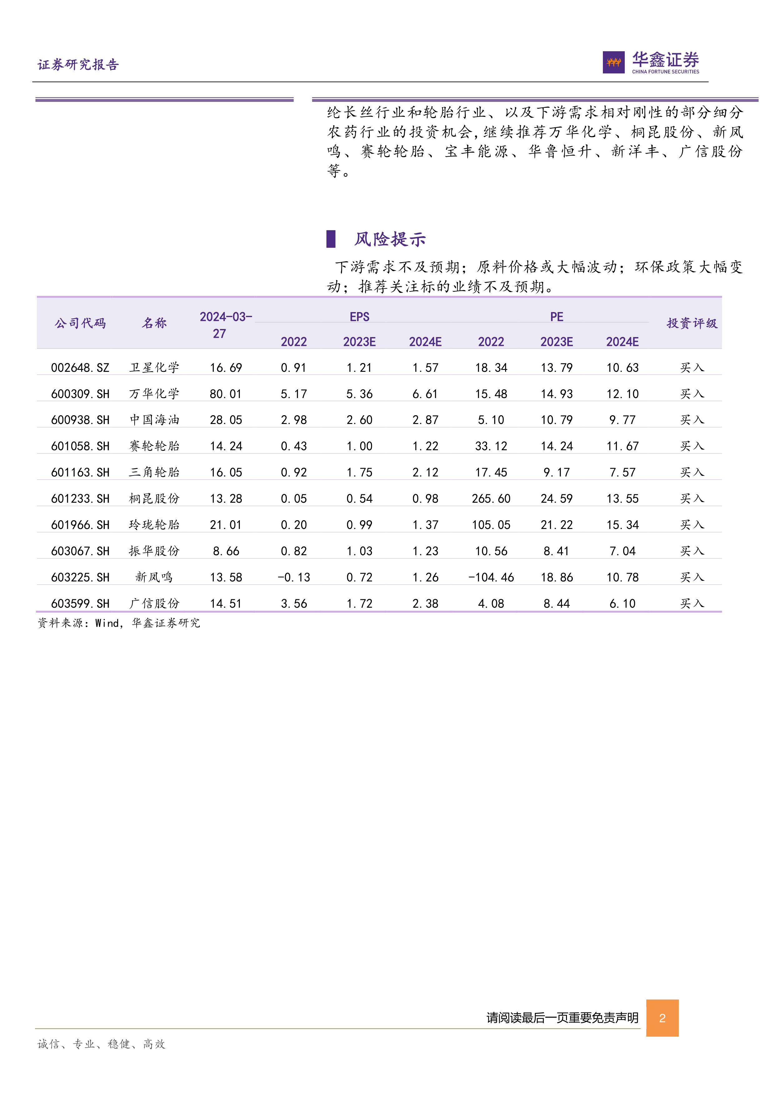 报告对万华化学、三角轮胎、新凤鸣、玲珑轮胎和赛轮轮胎等重点化工公司进行了业绩分析和发展战略解读,并结合行业景气度变化,对公司未来发展前景进行了展望。