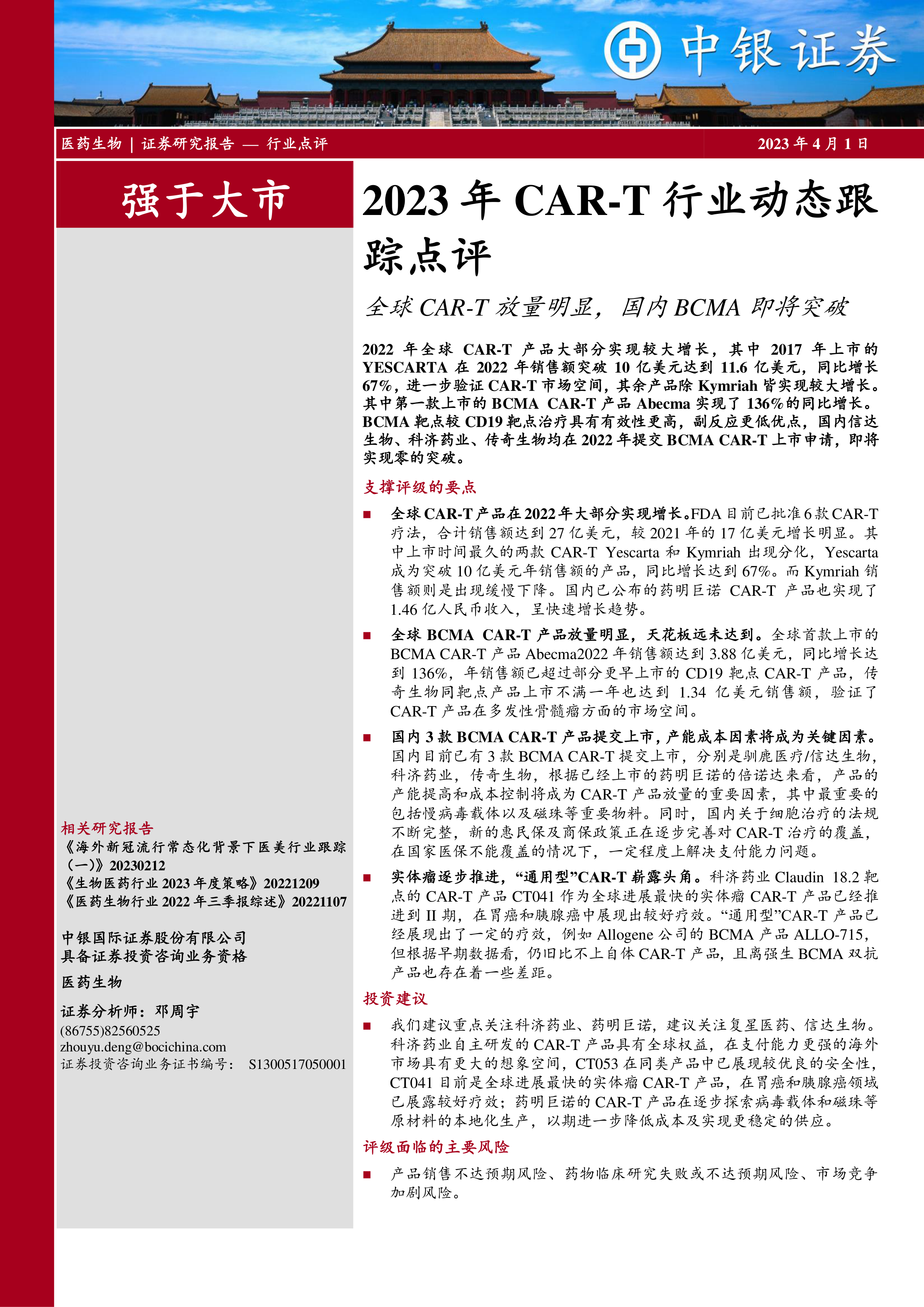 2023年CAR-T行业动态跟踪点评:全球CAR-T放量明显,国内BCMA即将突破