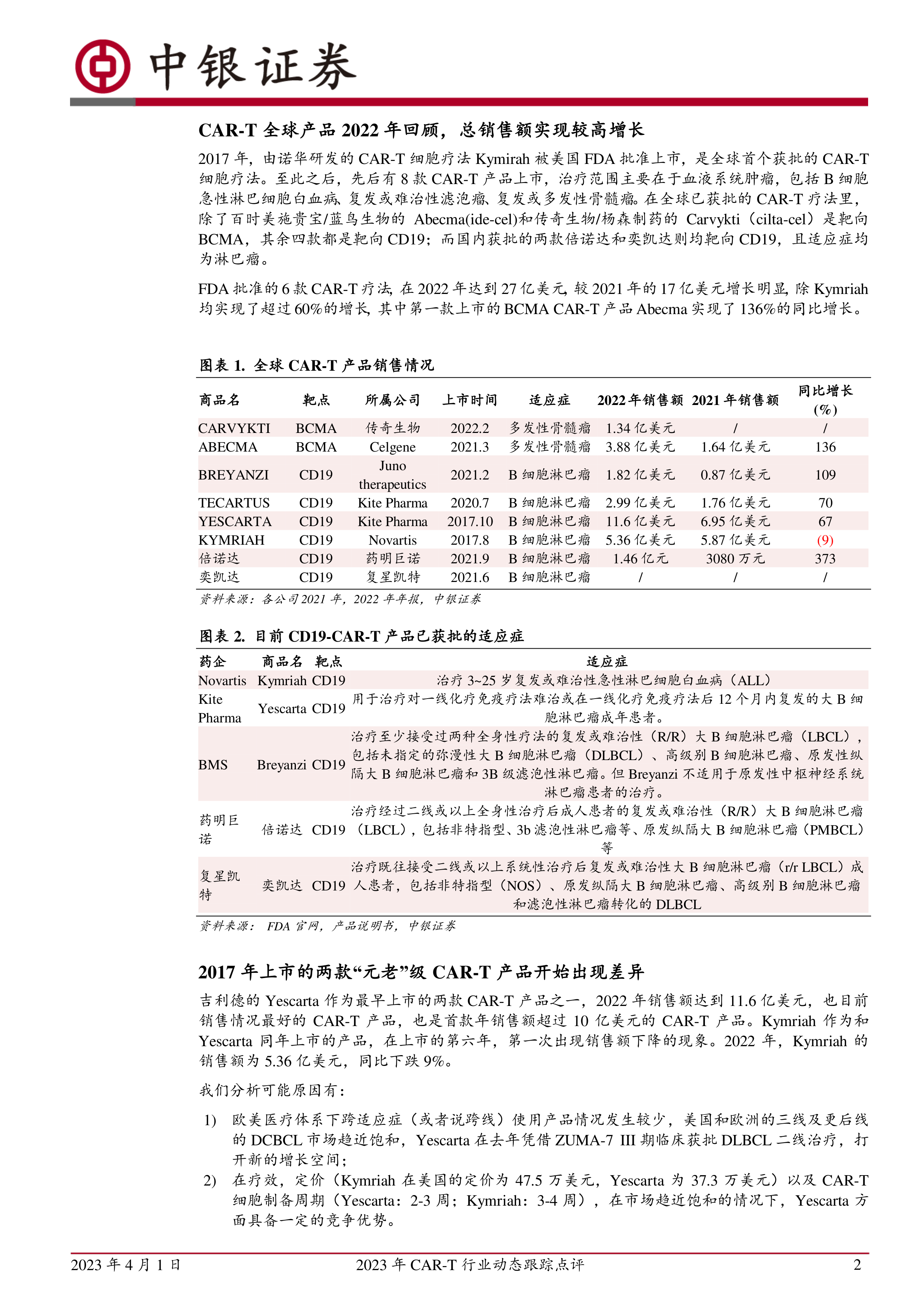 2017年上市的Yescarta和Kymriah,在2022年表现出明显差异。Yescarta销售额突破10亿美元,而Kymriah销售额下降。这可能与Yescarta拓展了DLBCL二线治疗适应症,以及在定价和生产周期方面具备竞争优势有关。