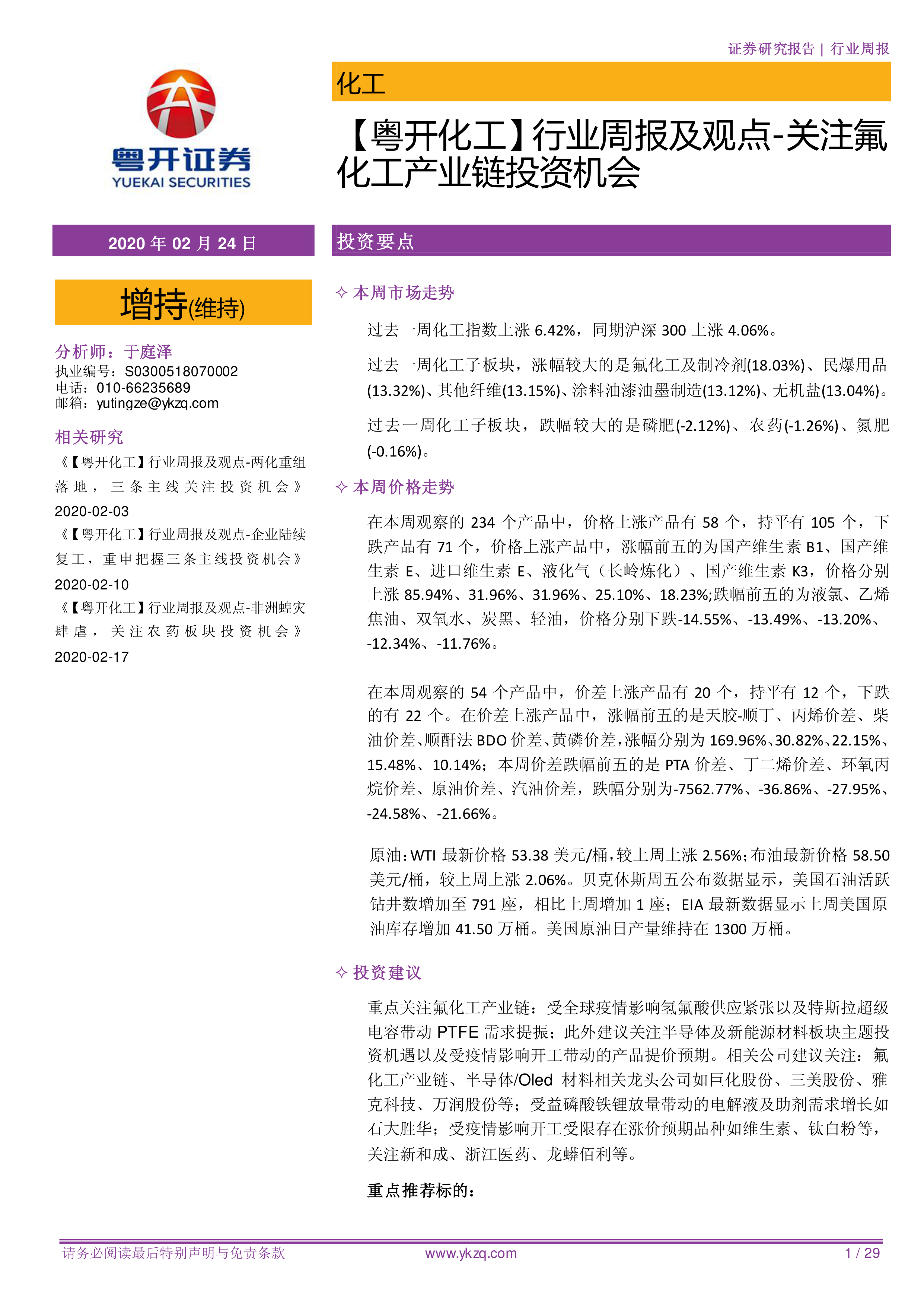 本报告为粤开证券发布的化工行业周报,主要内容涵盖以下几个方面: