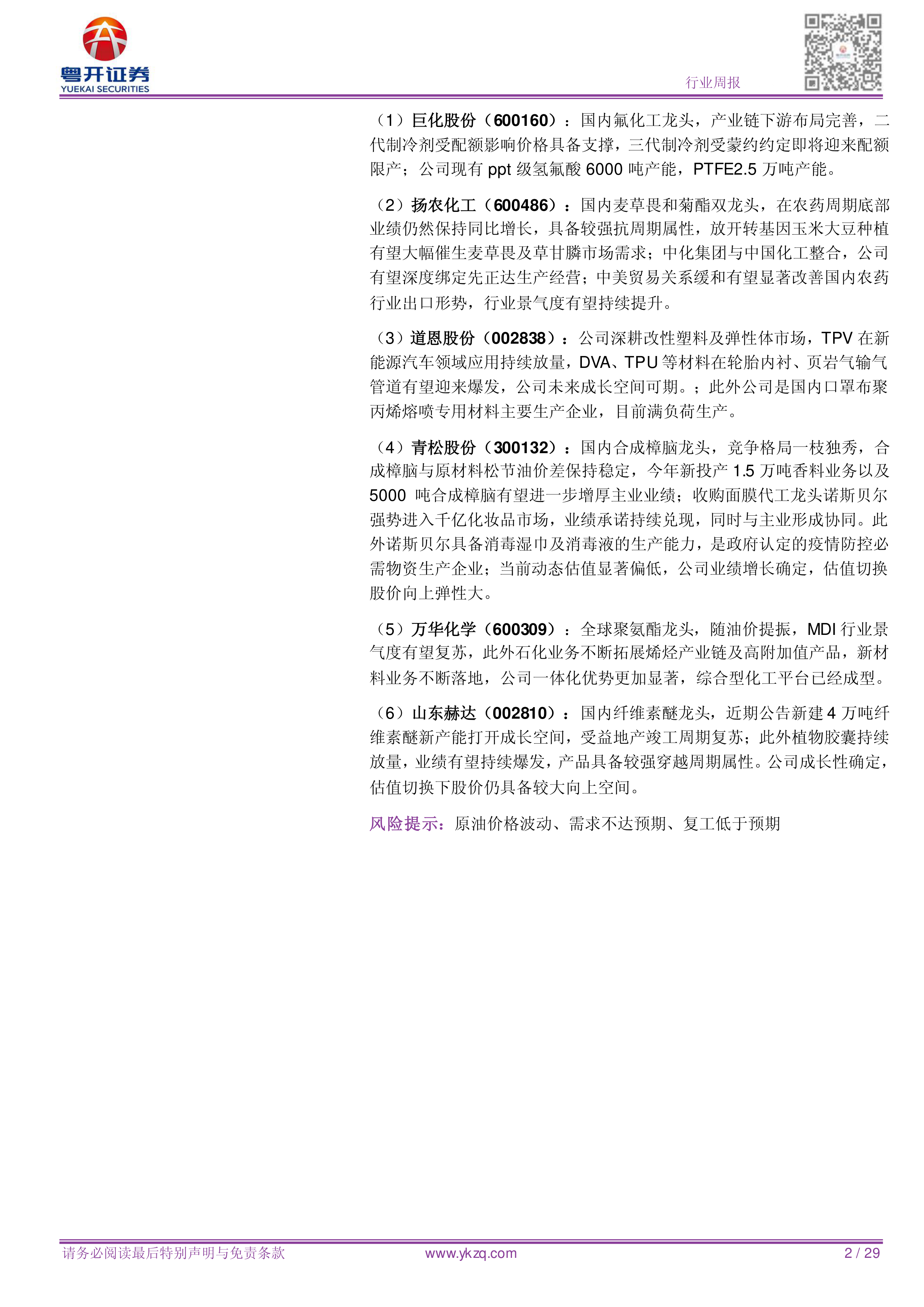 报告的核心投资建议是重点关注氟化工产业链的投资机会,并建议关注半导体及新能源材料板块主题投资机遇,以及受疫情影响开工受限存在涨价预期品种。报告推荐了六家公司作为重点关注标的,并对每家公司进行了简要的分析,包括其在行业中的地位、产品线、以及未来发展前景等。 这些公司分别是:巨化股份(氟化工龙头)、扬农化工(农药龙头)、道恩股份(改性塑料及弹性体)、青松股份(合成樟脑龙头)、万华化学(全球聚氨酯龙头)和山东赫达(纤维素醚龙头)。