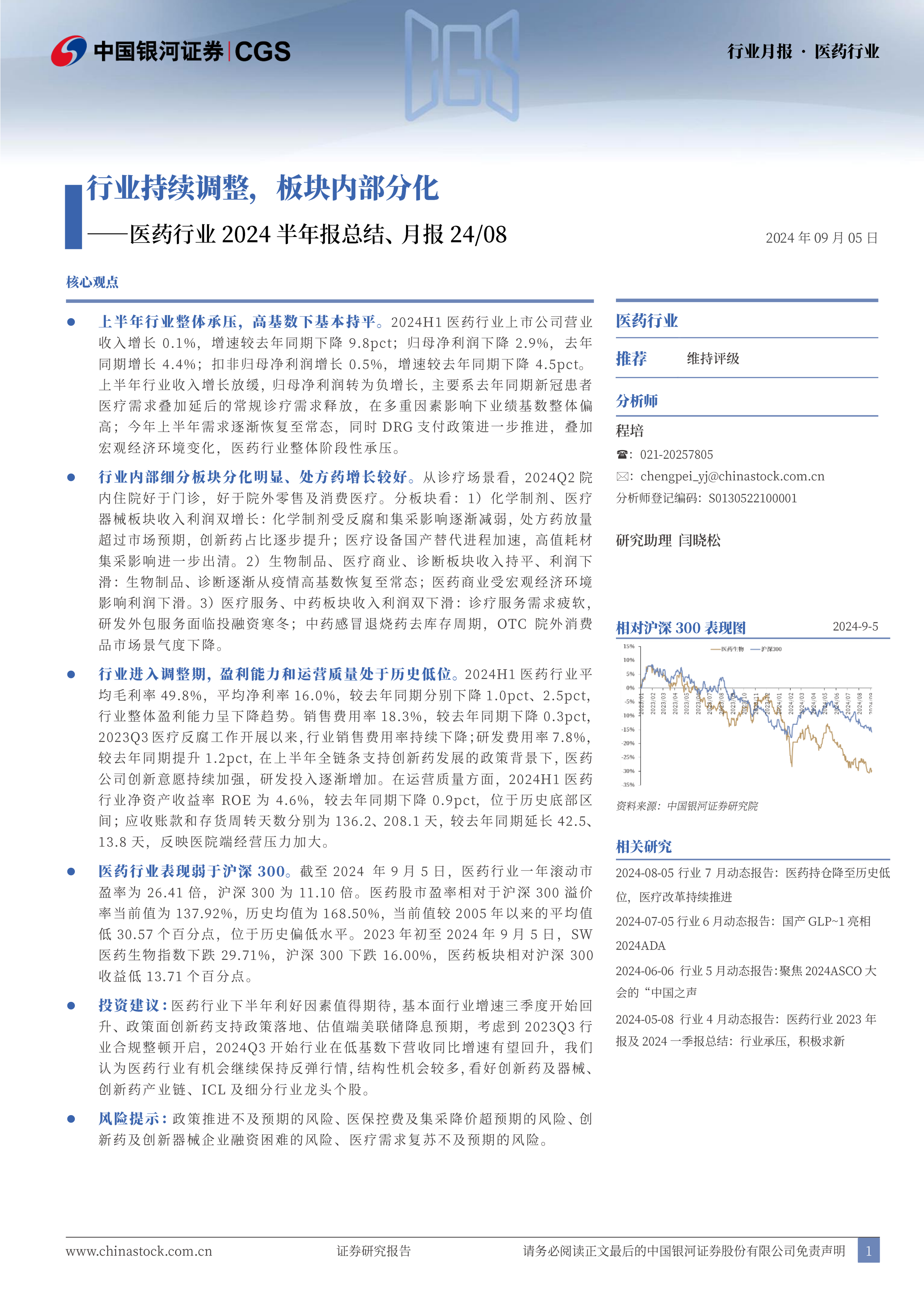 医药行业2024半年报总结、月报24/08:行业持续调整,板块内部分化