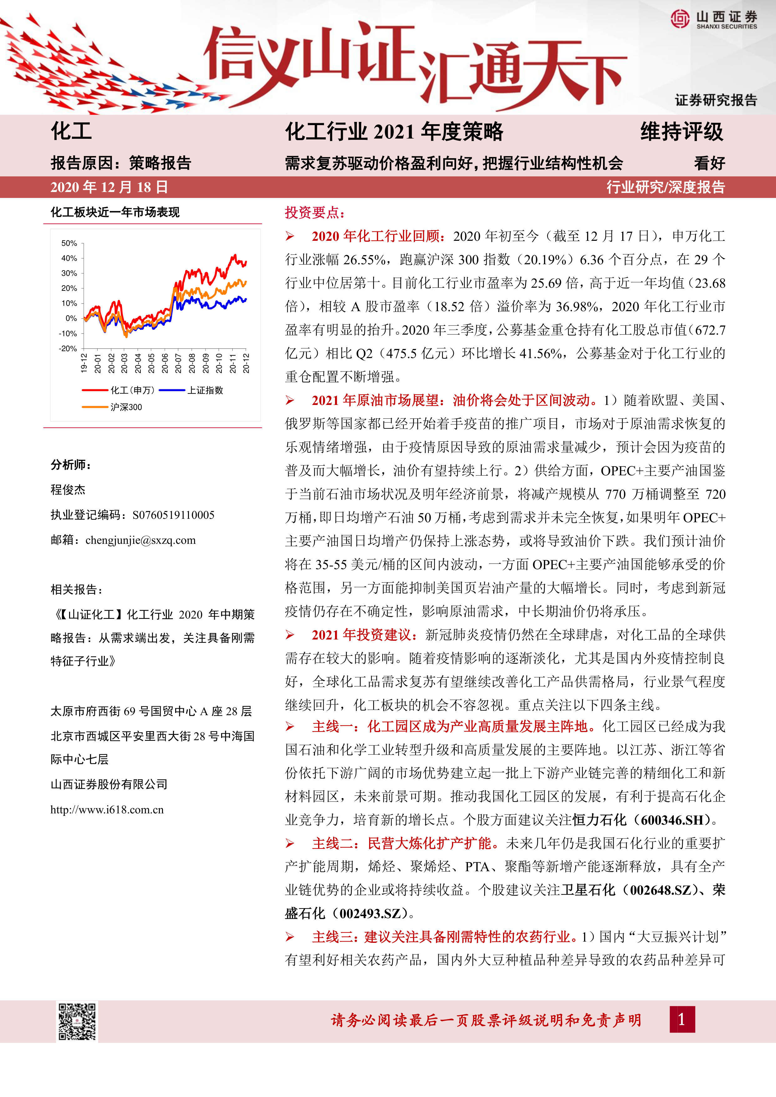 本报告的核心观点是:2020年化工行业表现强劲,跑赢大盘,估值抬升,机构资金持续加仓;2021年,在全球疫情逐渐缓和、需求复苏的背景下,化工行业景气度有望继续回升,投资机会值得关注。报告建议重点关注四个投资主线:化工园区、民营大炼化扩产扩能、具备刚需特性的农药行业以及“十四五”规划重点发展的新材料产业。 同时,报告也指出了宏观经济、原油价格波动、疫情反复以及下游需求等潜在风险。