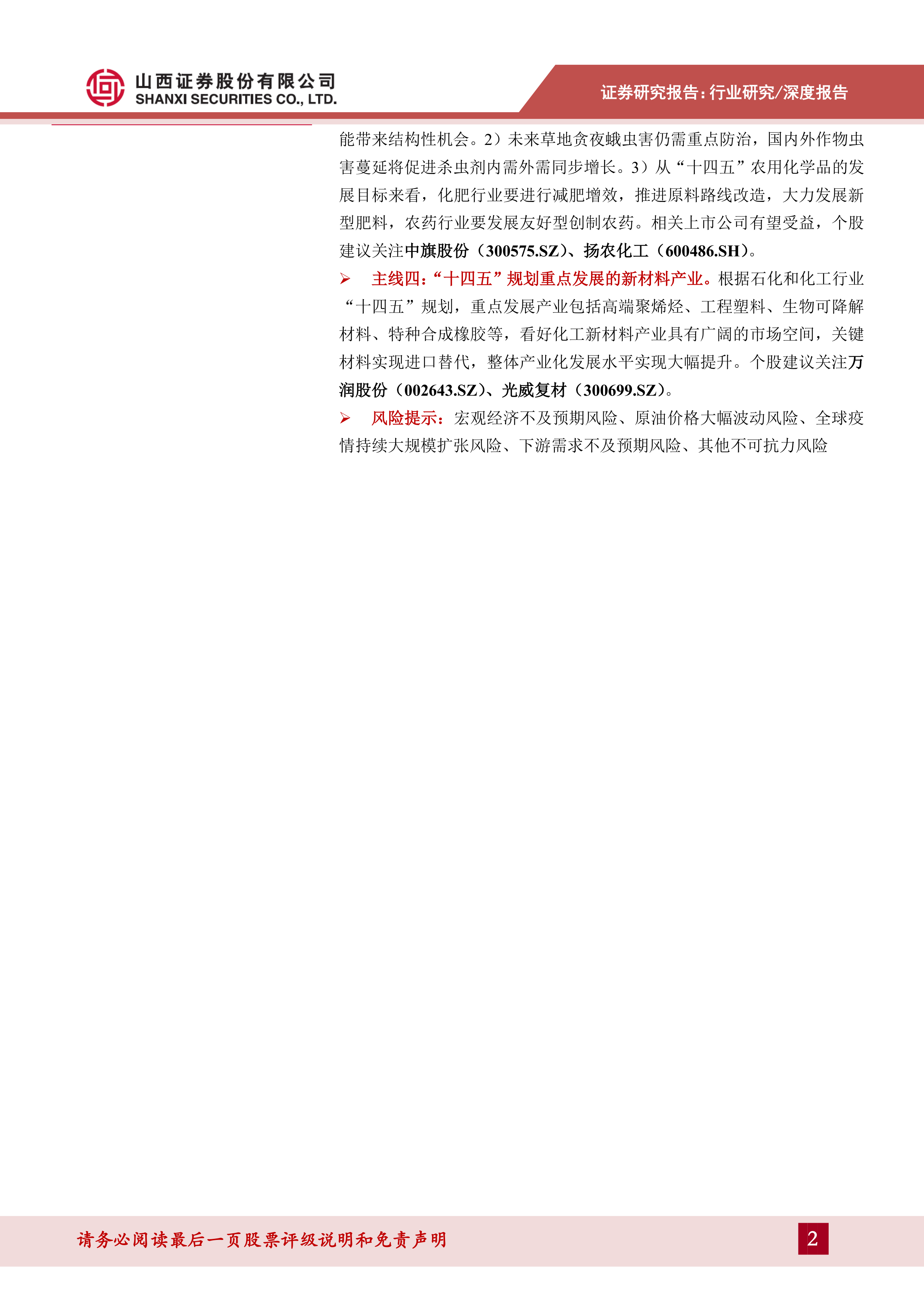 主线三:建议关注具备刚需特性的农药行业。1)国内“大豆振兴计划”有望利好相关农药产品,国内外大豆种植品种差异导致的农药品种差异可能带来结构性机会。2)未来草地贪夜蛾虫害仍需重点防治,国内外作物虫害蔓延将促进杀虫剂内需外需同步增长。3)从“十四五”农用化学品的发展目标来看,化肥行业要进行减肥增效,推进原料路线改造,大力发展新型肥料,农药行业要发展友好型创制农药。相关上市公司有望受益,个股建议关注中旗股份(300575.SZ)、扬农化工(600486.SH)。