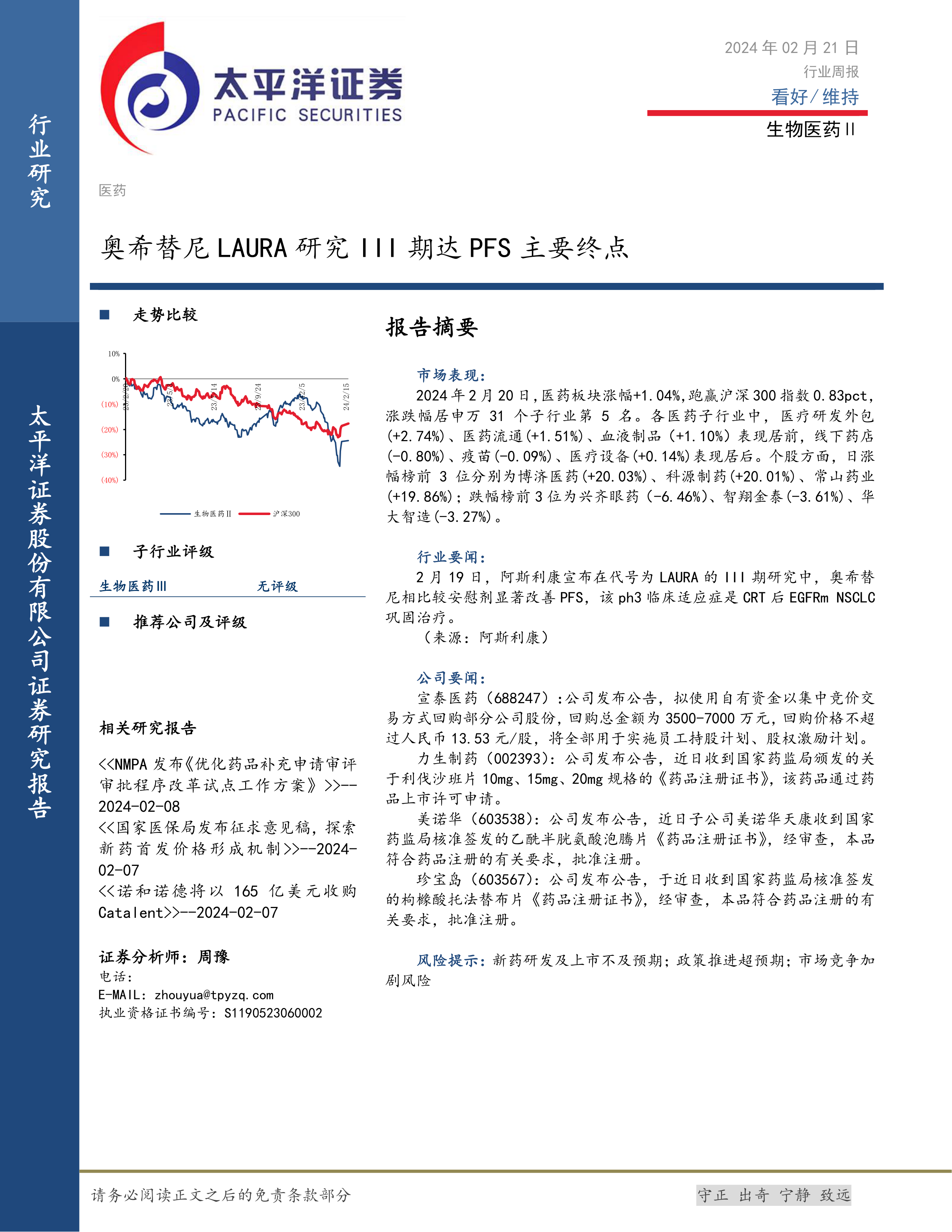 本报告基于2024年2月21日的数据,对生物医药行业进行了分析。奥希替尼LAURA III期临床试验的成功为行业发展注入强心剂。行业整体表现良好,但子行业和个股表现分化明显,部分公司业绩突出,部分公司表现相对滞后。 报告中提到的行业政策变化和公司新闻也为投资者提供了重要的参考信息。 然而,报告内容较为简略,缺乏更深入的数据分析和对未来趋势的预测,建议投资者结合其他信息来源进行综合判断,谨慎投资。
