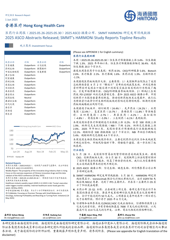 本报告的核心观点是:2025年5月26日至30日,香港医疗保健指数强劲上涨,主要受美国法院暂停特朗普关税政策和ASCO 2025摘要公布的积极消息推动。尽管美国联邦上诉法院随后恢复了关税,但短期内创新药板块的地缘政治风险仍可控。报告详细分析了本周港股及美股医药板块的表现,以及多个重要行业动态,包括ASCO 2025摘要中多家中国创新药企的亮眼数据、SMMT HARMONi研究的顶线数据、石药集团的Q1业绩以及信诺维与安斯泰来的合作等。