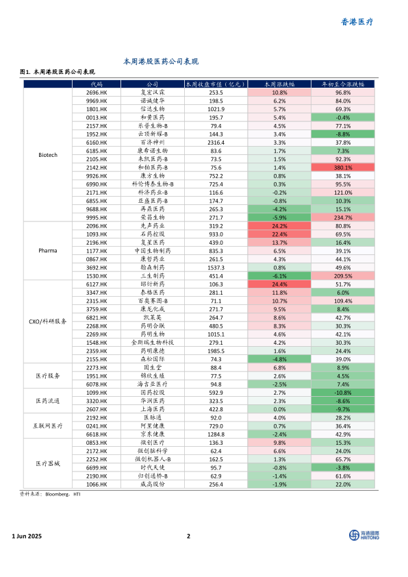 本周( 2025.05.26-2025.05.30) 恒生医疗保健指数上涨 3.4%,恒生指数下跌 1.3%。 2025 年年初以来,恒生医疗保健指数涨幅达 36.4%,跑赢恒生指数 20.3 个百分点。