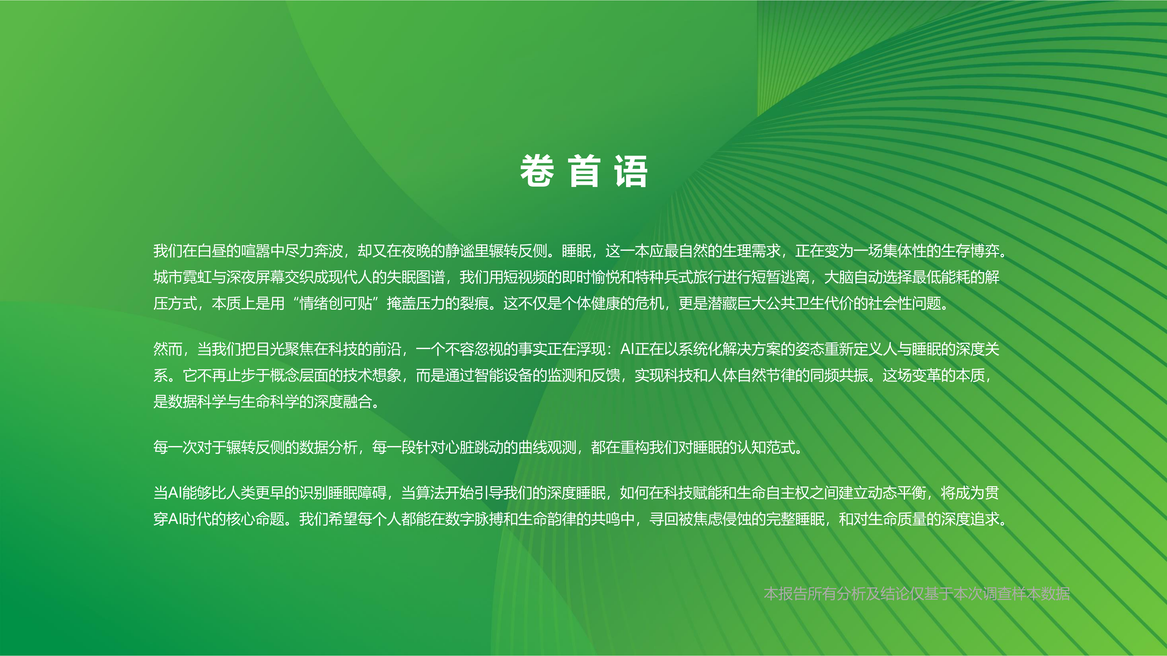本报告以2025年AI时代健康睡眠白皮书为基础,运用统计数据和专业分析,揭示了中国国民睡眠现状及AI技术在改善睡眠方面的应用前景。核心观点如下: