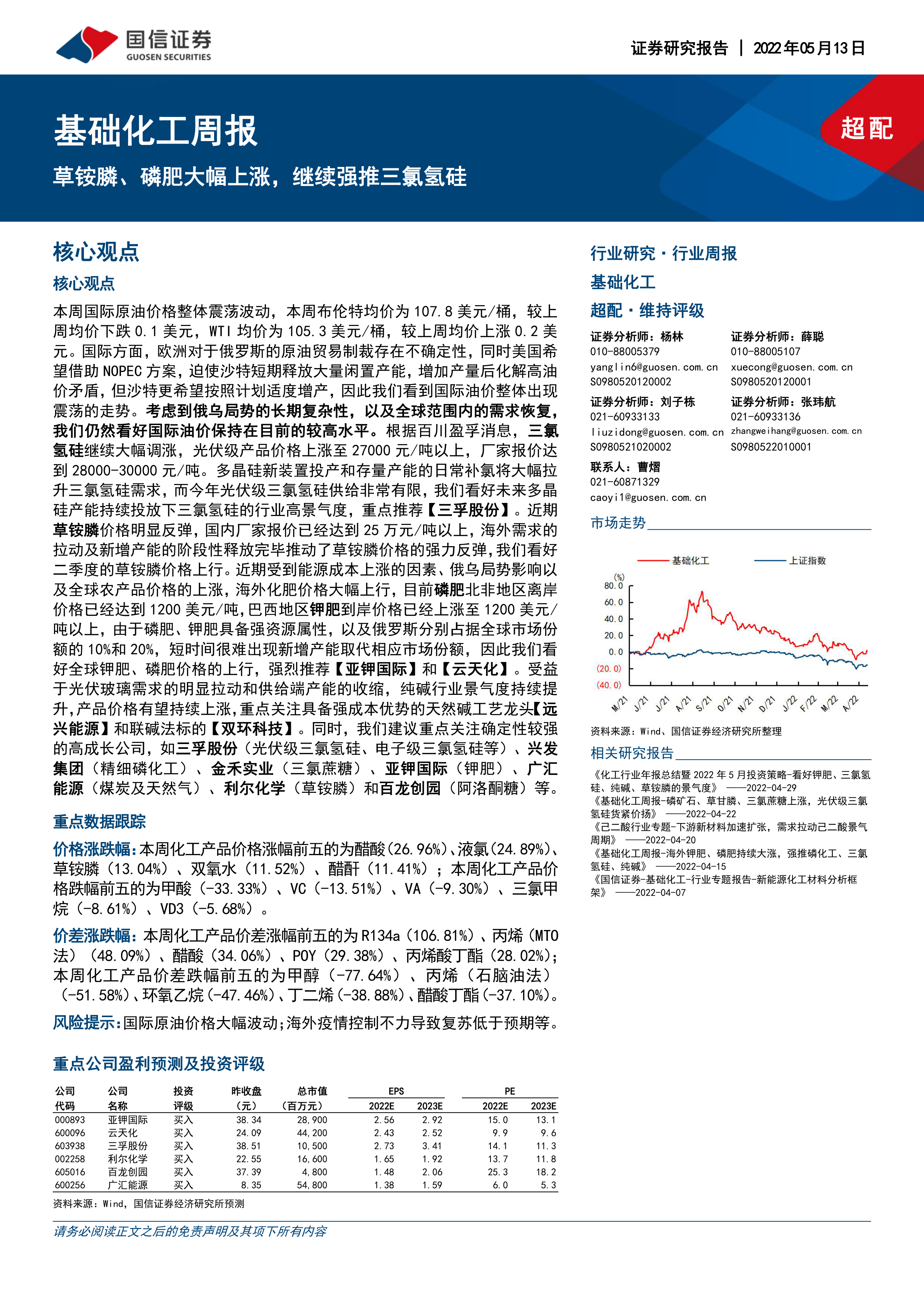 本周国际原油价格整体震荡波动,本周布伦特均价为107.8美元/桶,较上周均价下跌0.1美元,WTI均价为105.3美元/桶,较上周均价上涨0.2美元。国际方面,欧洲对于俄罗斯的原油贸易制裁存在不确定性,同时美国希望借助NOPEC方案,迫使沙特短期释放大量闲置产能,增加产量后化解高油价矛盾,但沙特更希望按照计划适度增产,因此我们看到国际油价整体出现震荡的走势。考虑到俄乌局势的长期复杂性,以及全球范围内的需求恢复,我们仍然看好国际油价保持在目前的较高水平。根据百川盈孚消息,三氯氢硅继续大幅调涨,光伏级产品价格上涨至27000元/吨以上,厂家报价达到28000-30000元/吨。多晶硅新装置投产和存量产能的日常补氯将大幅拉升三氯氢硅需求,而今年光伏级三氯氢硅供给非常有限,我们看好未来多晶硅产能持续投放下三氯氢硅的行业高景气度,重点推荐【三孚股份】。近期草铵膦价格明显反弹,国内厂家报价已经达到25万元/吨以上,海外需求的拉动及新增产能的阶段性释放完毕推动了草铵膦价格的强力反弹,我们看好二季度的草铵膦价格上行。近期受到能源成本上涨的因素、俄乌局势影响以及全球农产品价格的上涨,海外化肥价格大幅上行,目前磷肥北非地区离岸价格已经达到1200美元/吨,巴西地区钾肥到岸价格已经上涨至1200美元/吨以上,由于磷肥、钾肥具备强资源属性,以及俄罗斯分别占据全球市场份额的10%和20%,短时间很难出现新增产能取代相应市场份额,因此我们看好全球钾肥、磷肥价格的上行,强烈推荐【亚钾国际】和【云天化】。受益于光伏玻璃需求的明显拉动和供给端产能的收缩,纯碱行业景气度持续提升,产品价格有望持续上涨,重点关注具备强成本优势的天然碱工艺龙头【远兴能源】和联碱法标的【双环科技】。同时,我们建议重点关注确定性较强的高成长公司,如三孚股份(光伏级三氯氢硅、电子级三氯氢硅等)、兴发集团(精细磷化工)、金禾实业(三氯蔗糖)、亚钾国际(钾肥)、广汇能源(煤炭及天然气)、利尔化学(草铵膦)和百龙创园(阿洛酮糖)等。