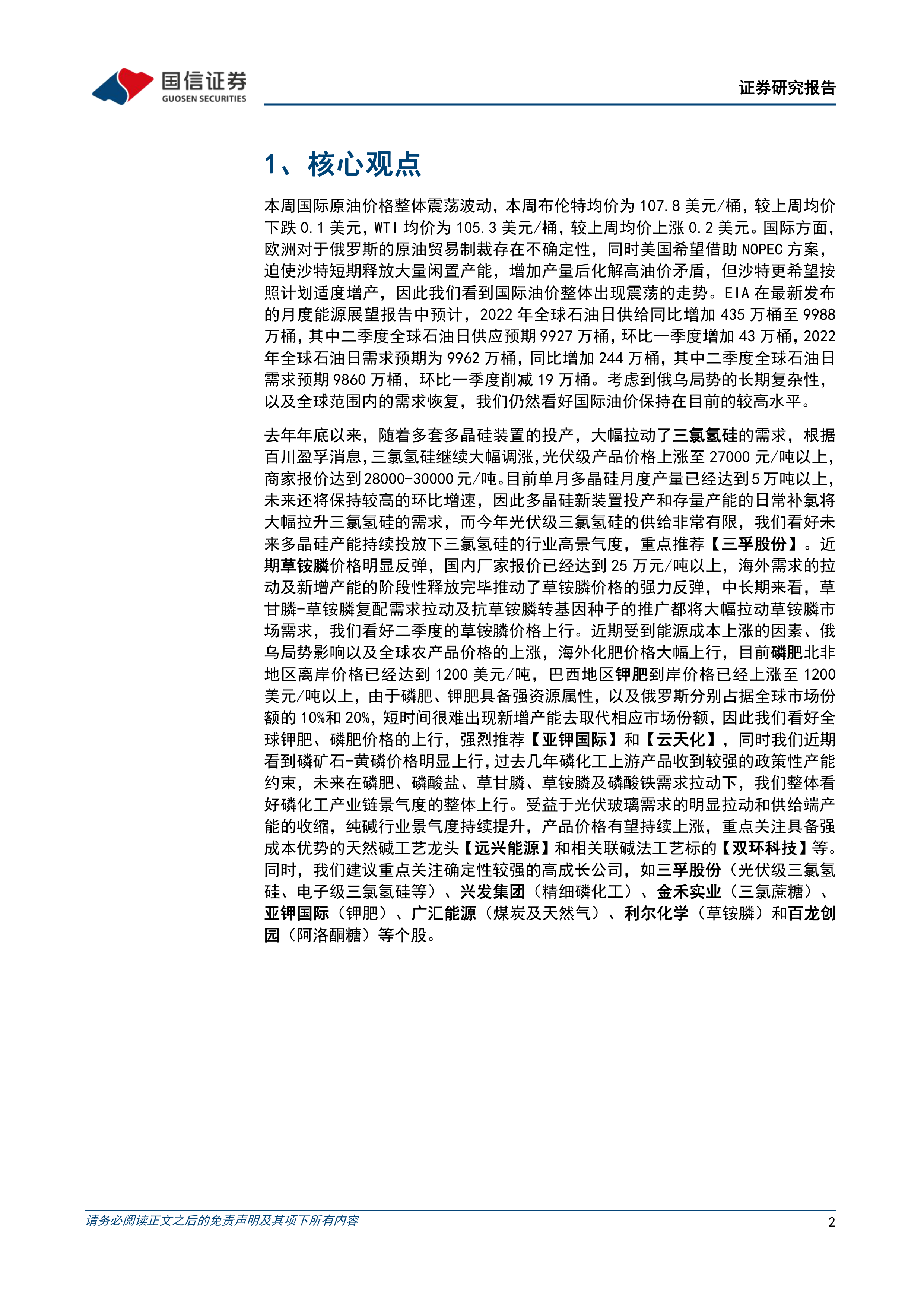 本报告的核心观点是:基于国际原油价格震荡、俄乌冲突持续以及全球需求恢复等因素,看好国际油价维持高位;重点推荐受益于行业高景气度的三氯氢硅、草铵膦、磷肥、钾肥以及纯碱相关个股,并关注高成长性公司。