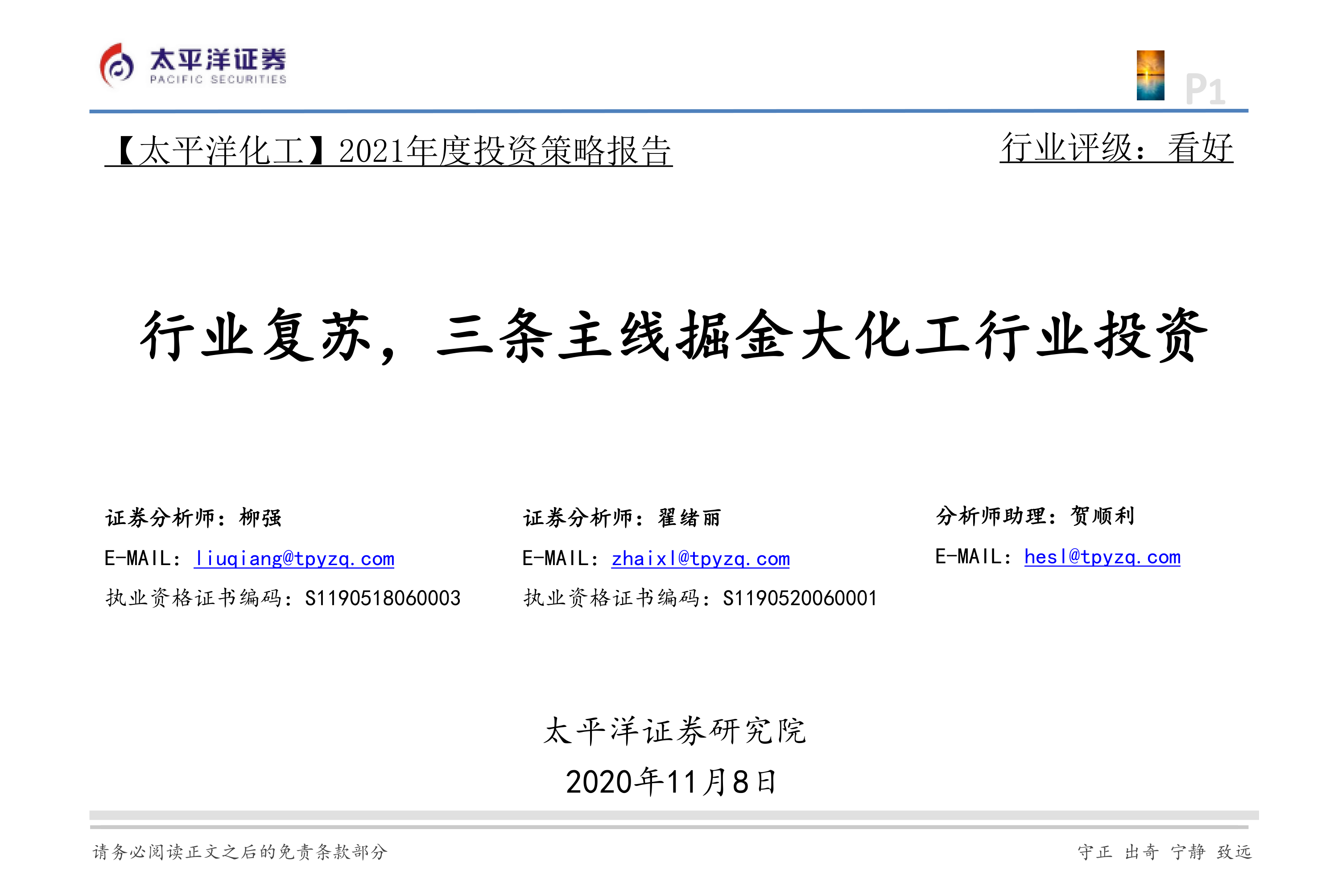 【 太平洋化工】2021年度投资策略报告:行业复苏,三条主线掘金大化工行业投资