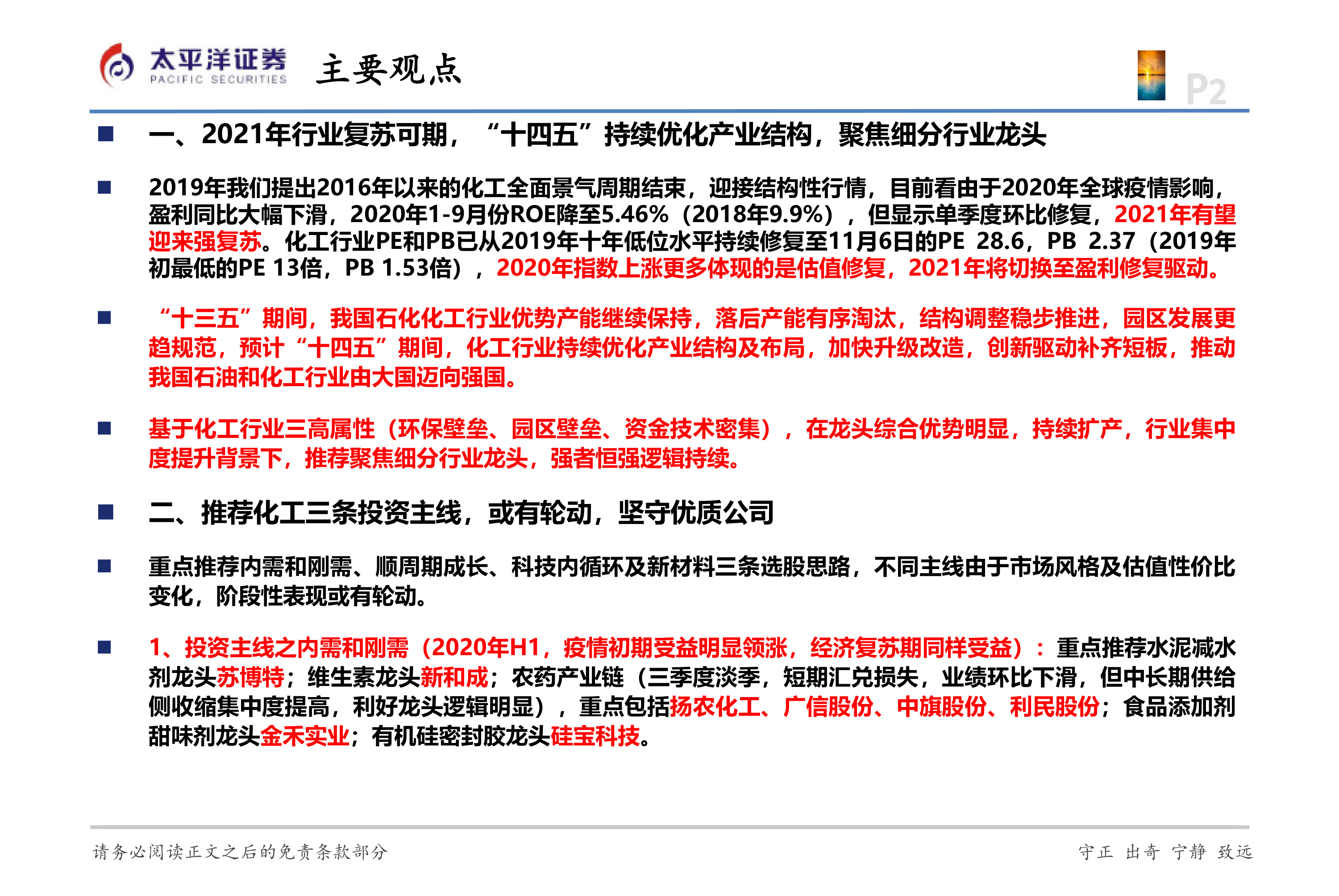 1、 投资主线之内需和刚需(2020年H1, 疫情初期受益明显领涨, 经济复苏期同样受益) : 重点推荐水泥减水剂龙头苏博特;维生素龙头新和成;农药产业链(三季度淡季, 短期汇兑损失, 业绩环比下滑, 但中长期供给侧收缩集中度提高, 利好龙头逻辑明显) , 重点包括扬农化工、 广信股份、 中旗股份、 利民股份; 食品添加剂甜味剂龙头金禾实业;有机硅密封胶龙头硅宝科技。