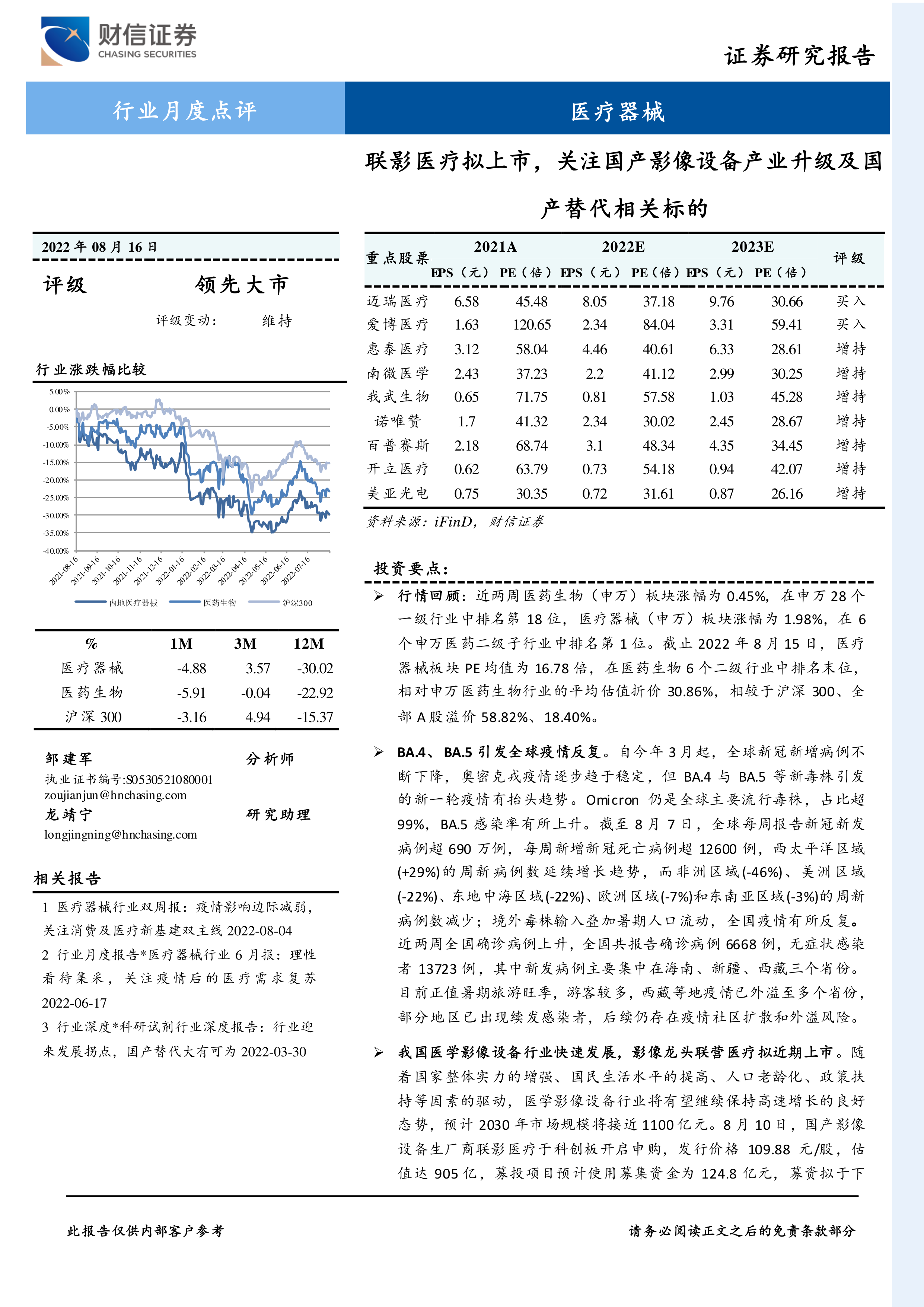 本报告通过对近期市场数据、新冠疫情数据以及联影医疗上市等事件的分析,指出国产医疗器械行业面临着机遇与挑战并存的局面。联影医疗的上市将加速国产替代进程,推动行业升级。报告建议关注受益于国产替代和消费医疗需求复苏的相关企业,包括上游零部件供应商、中游影像设备生产商以及受益于集采和新基建的企业。 然而,投资者仍需关注新冠疫情反复和集采政策变化等风险。 报告中提供的投资建议仅供参考,不构成投资建议,投资者需谨慎决策。