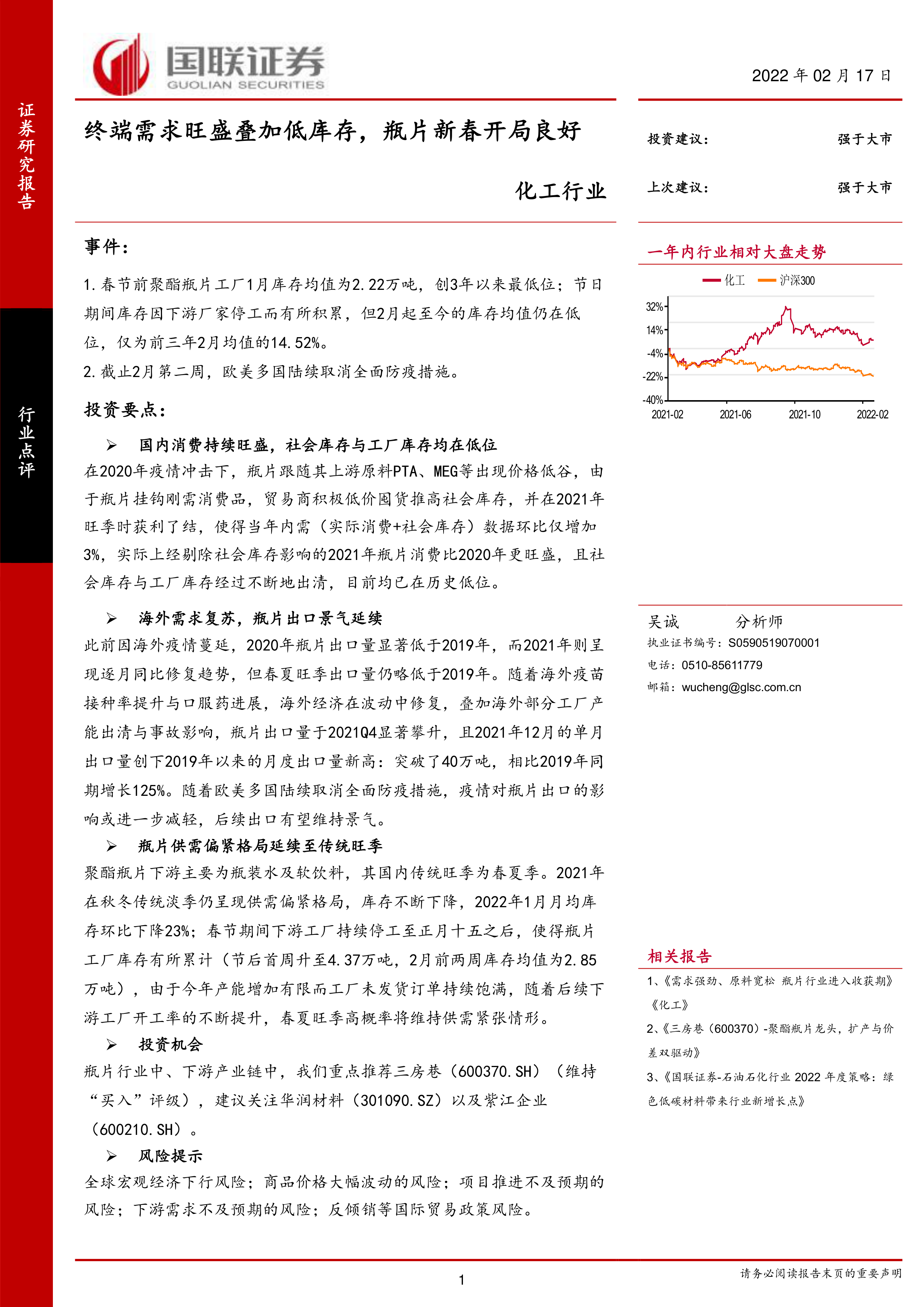 化工行业:终端需求旺盛叠加低库存,瓶片新春开局良好