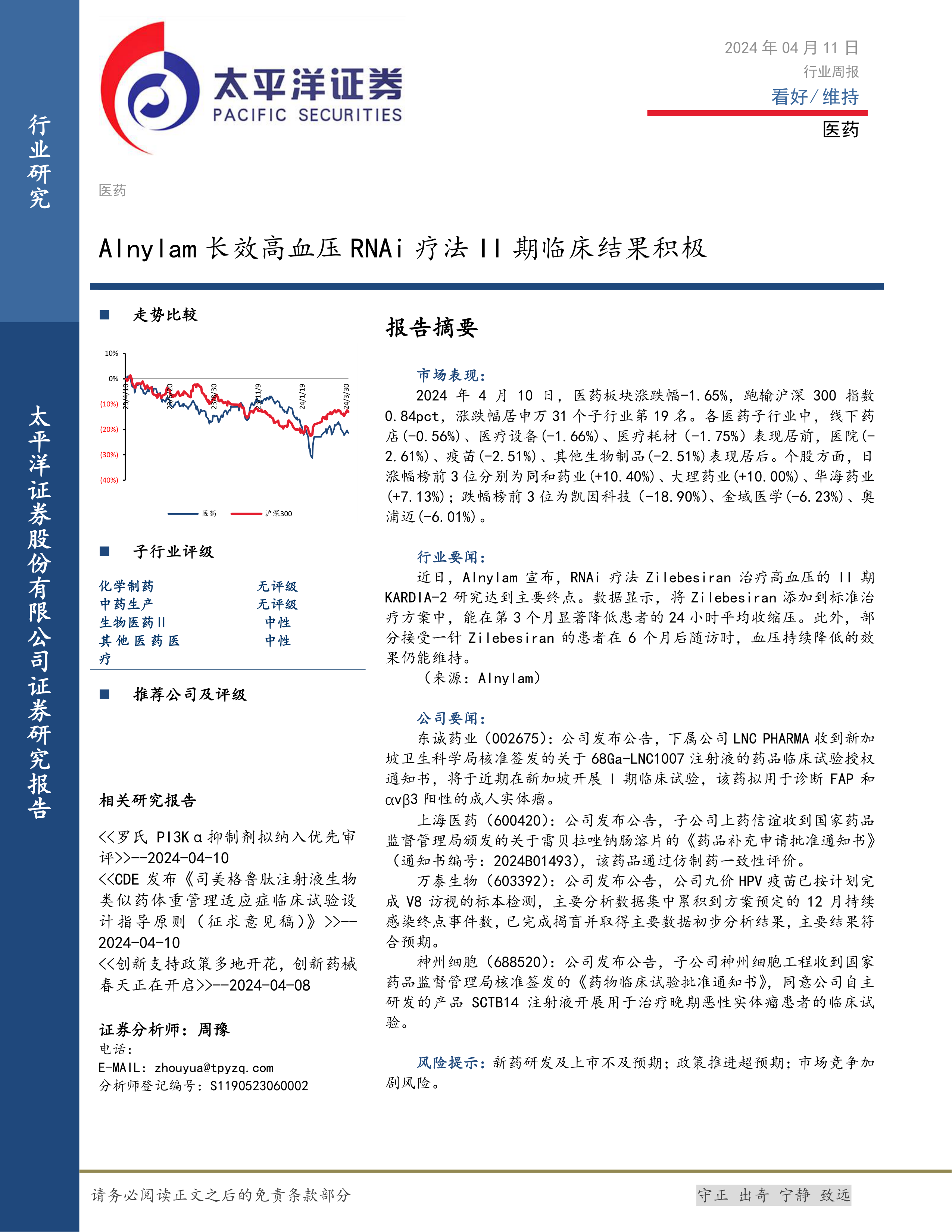 本报告对2024年4月11日医药行业周报进行了数据分析和解读。报告指出,医药行业整体表现平稳,但子行业间分化明显,部分子行业表现强劲,部分表现疲软。Alnylam公司长效高血压RNAi疗法II期临床试验结果积极,为行业发展注入利好。 报告还总结了多家医药公司的重要新闻事件,并对行业和公司进行了评级,为投资者提供了参考信息。 然而,投资者需注意新药研发及上市、政策推进以及市场竞争等风险。 未来医药行业发展仍存在不确定性,投资者需谨慎决策。