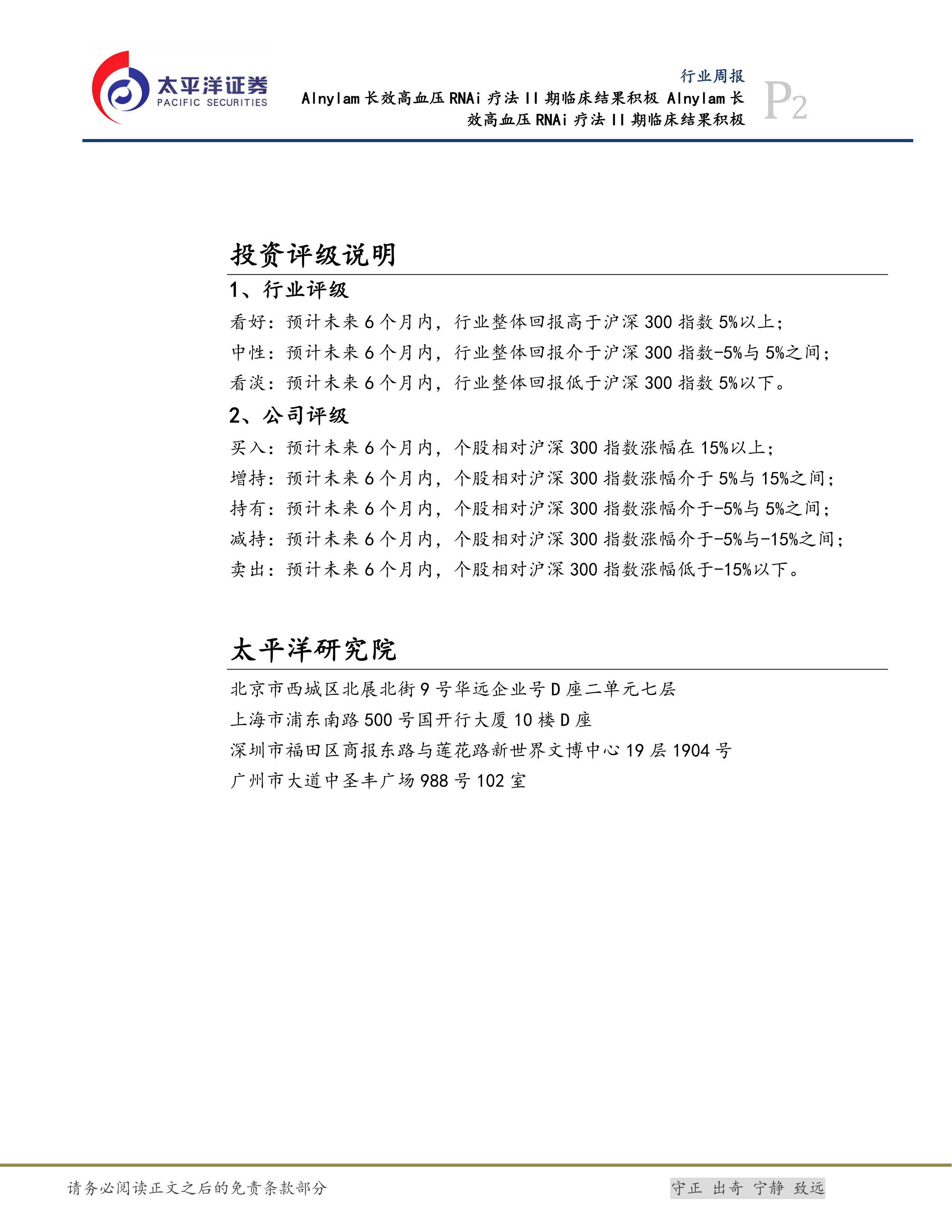 本报告的核心观点是:医药行业整体表现相对平稳,部分细分领域表现强劲,Alnylam公司长效高血压RNAi疗法II期临床试验结果积极为行业发展注入利好。 同时,报告也指出部分子行业表现疲软,并提示了新药研发及上市、政策推进以及市场竞争等风险。