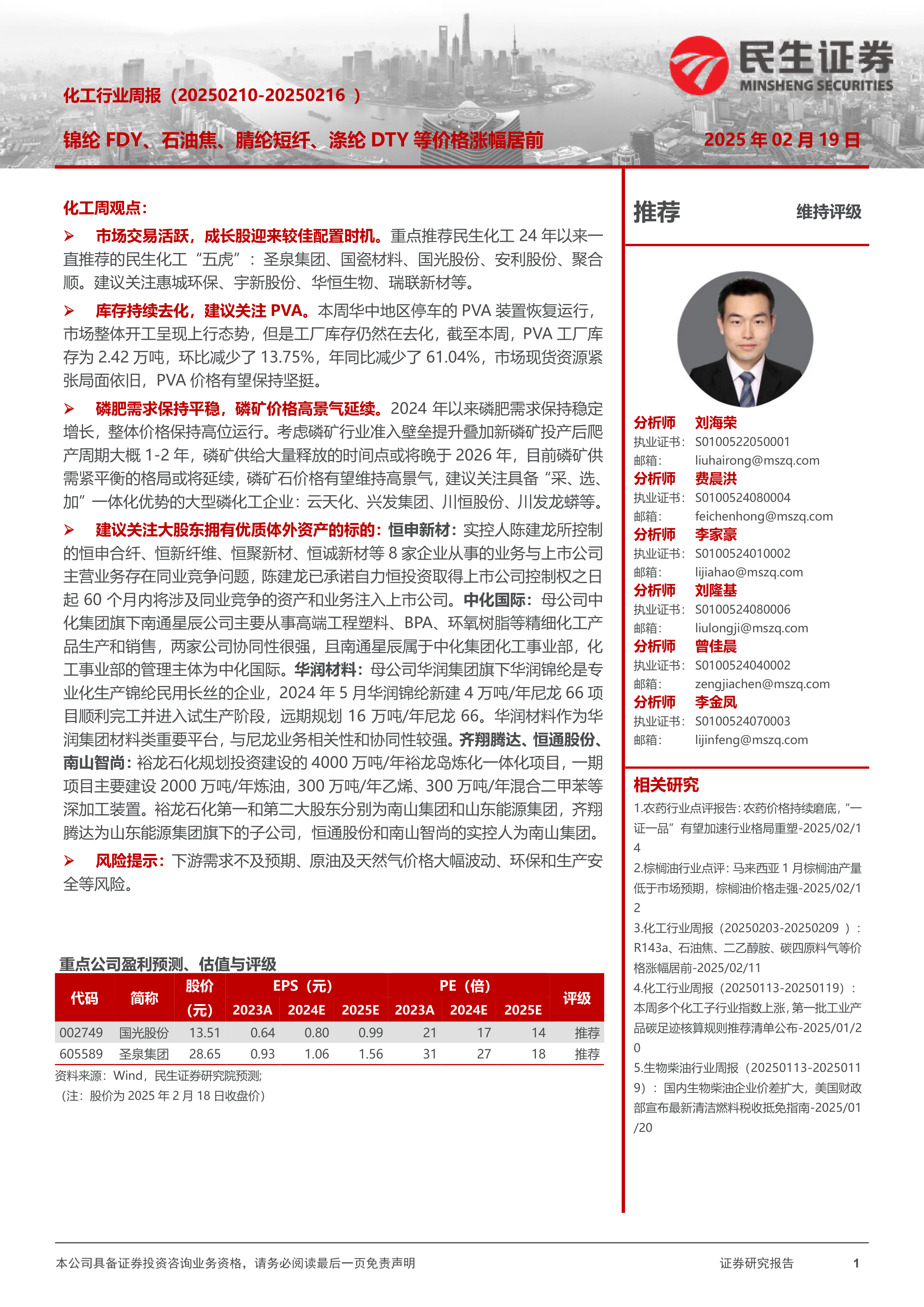 市场交易活跃,成长股迎来较佳配置时机。重点推荐民生化工24年以来一直推荐的民生化工“五虎”:圣泉集团、国瓷材料、国光股份、安利股份、聚合顺。建议关注惠城环保、宇新股份、华恒生物、瑞联新材等。