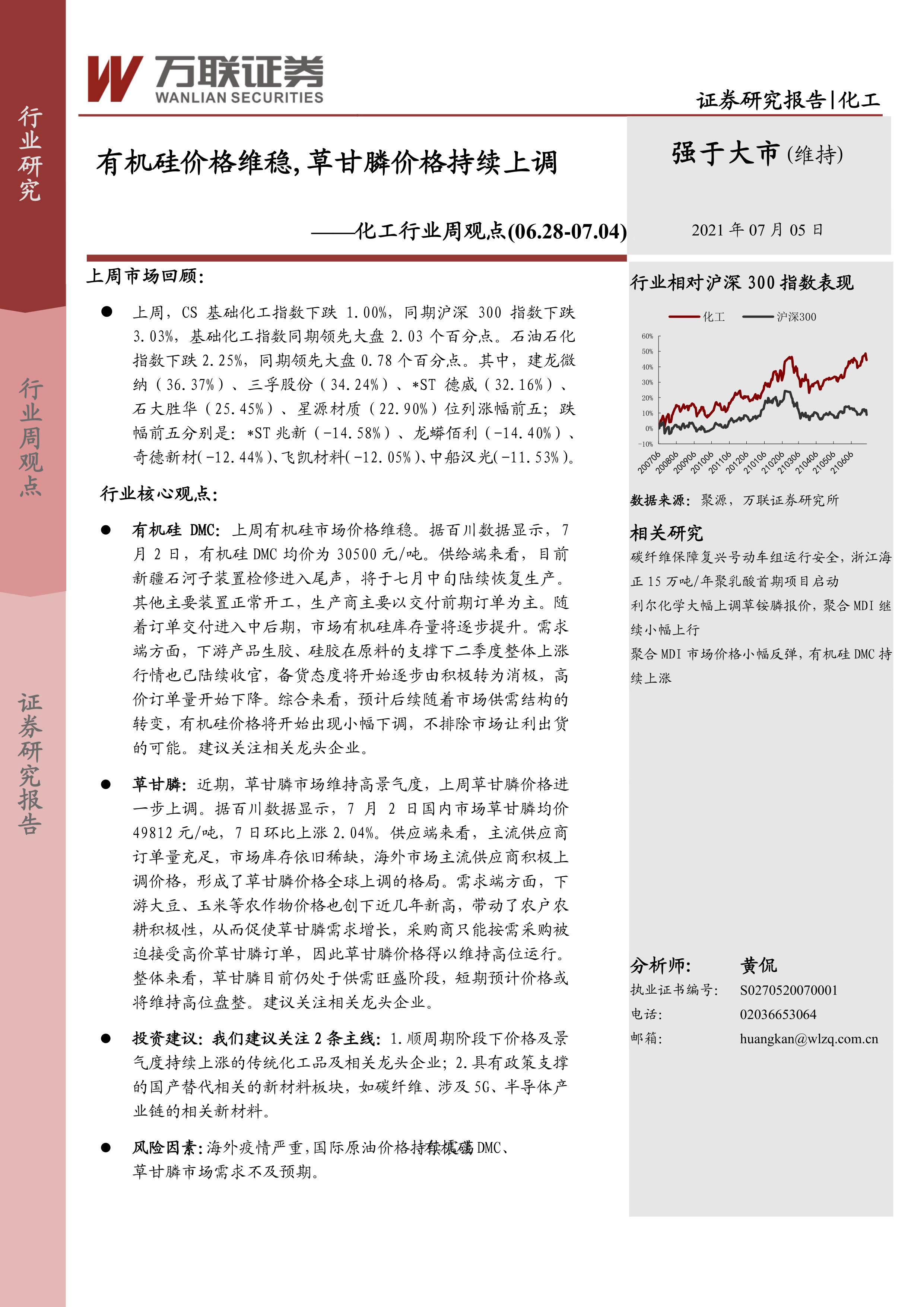本报告通过对上周化工市场行情的分析,特别是对有机硅DMC和草甘膦价格走势的深入解读,以及对重点化工产品价格变动和行业动态的总结,得出有机硅DMC价格短期内可能小幅下调,而草甘膦价格将维持高位运行的结论。报告建议投资者关注顺周期传统化工品和政策扶持的新材料板块,同时需注意海外疫情、原油价格波动和市场需求等风险因素。 报告数据主要来源于百川资讯和万联证券研究所,并辅以图表数据直观地展现了市场变化趋势。