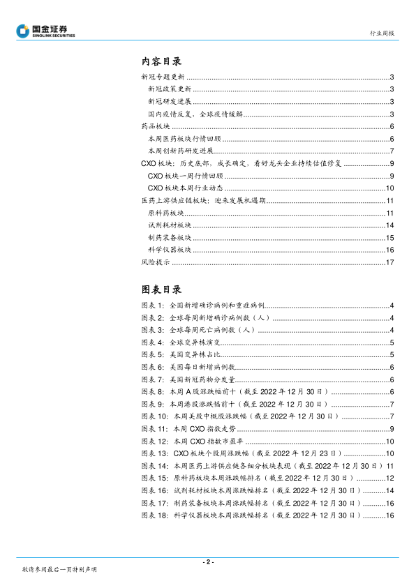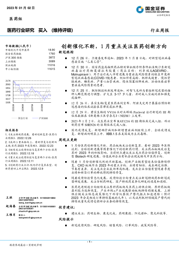 1 月份医药创新催化不断, 药品板块关注创新复苏,看好 2023 年医保谈判、全球创新进展等因素催化下的创新药行情。 关注药品板块疫后复苏对 2023 年的积极影响,当前时点建议关注龙头药企估值修复、创新型 Biotech 研发进展、 估值底部企业有机会出现反转及中医药方向。