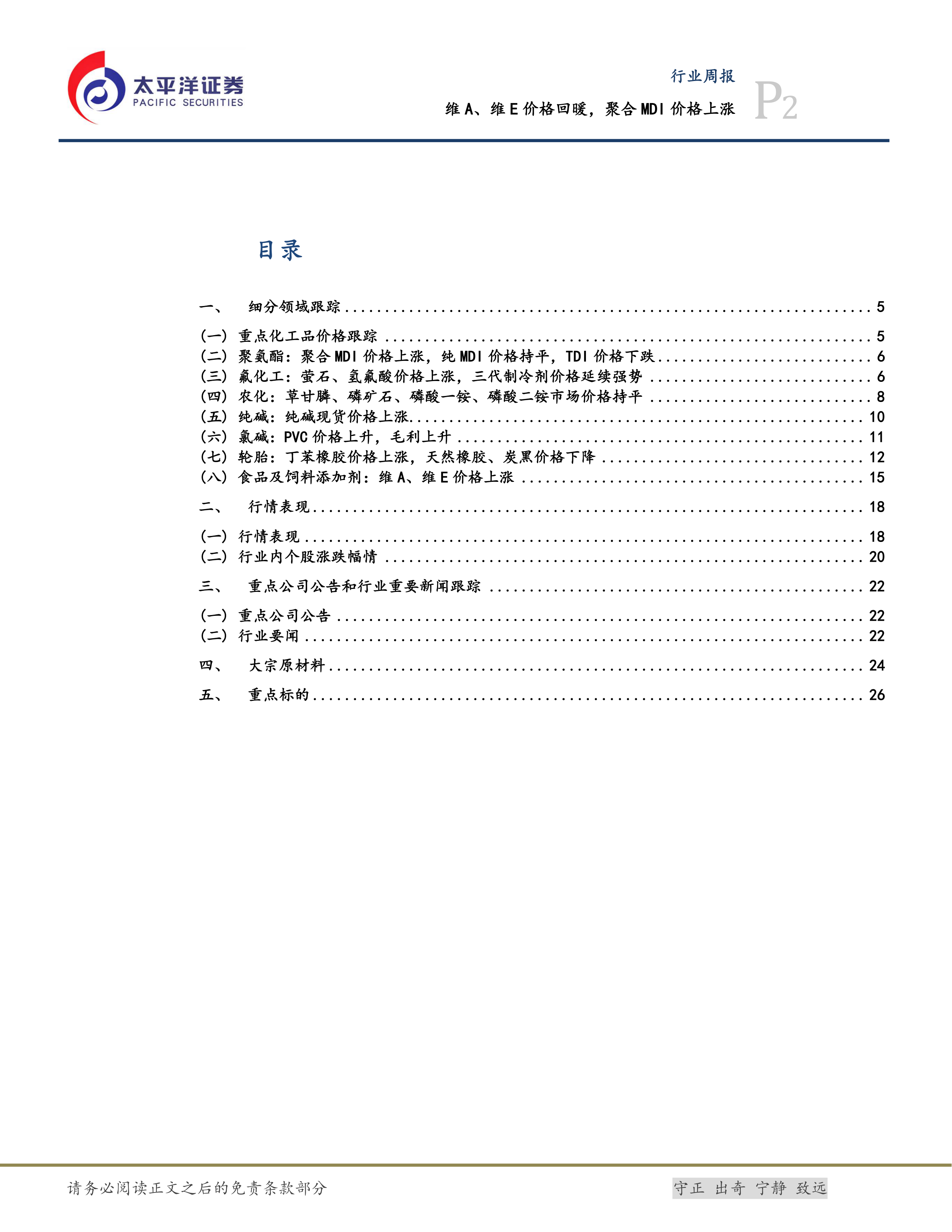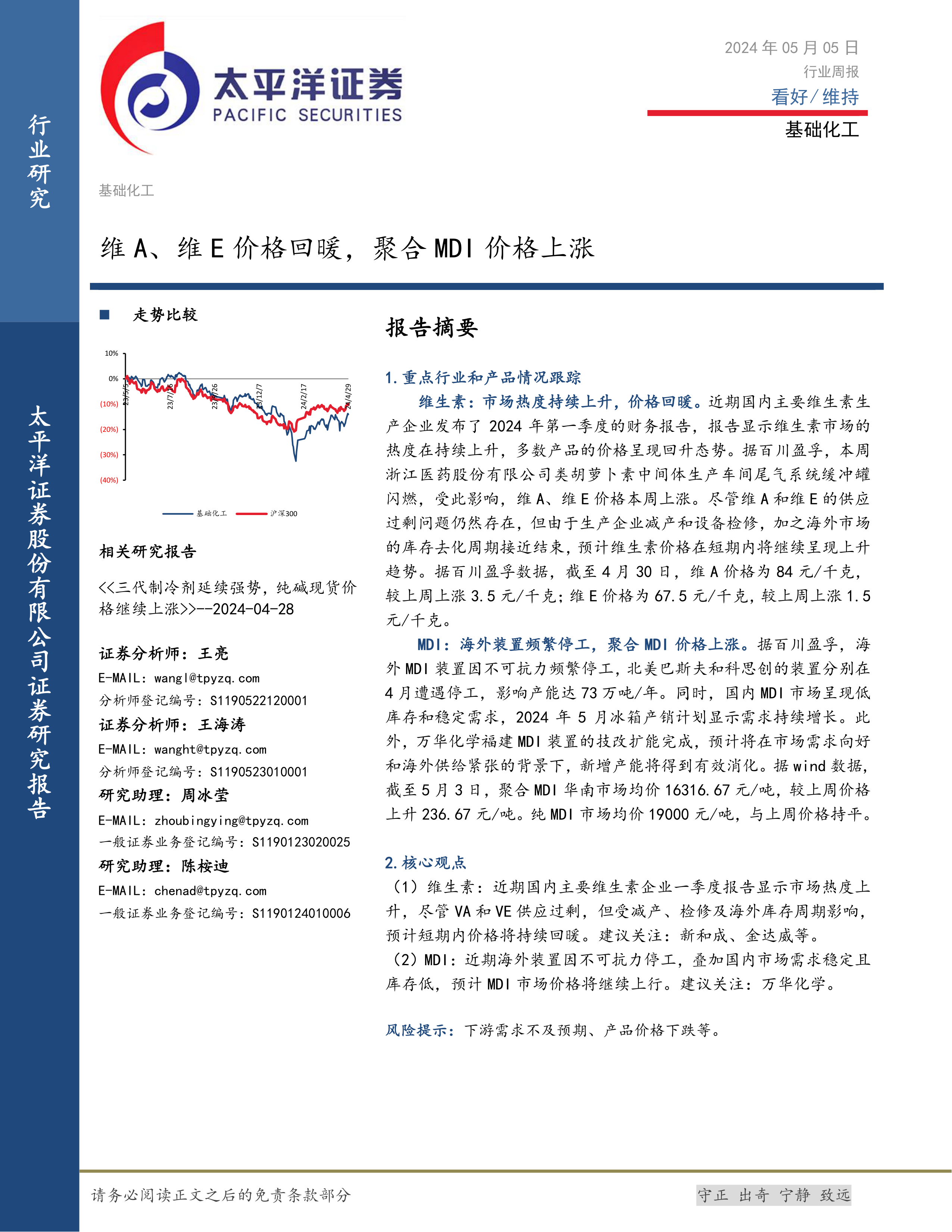 基础化工行业周报:维A、维E价格回暖,聚合MDI价格上涨