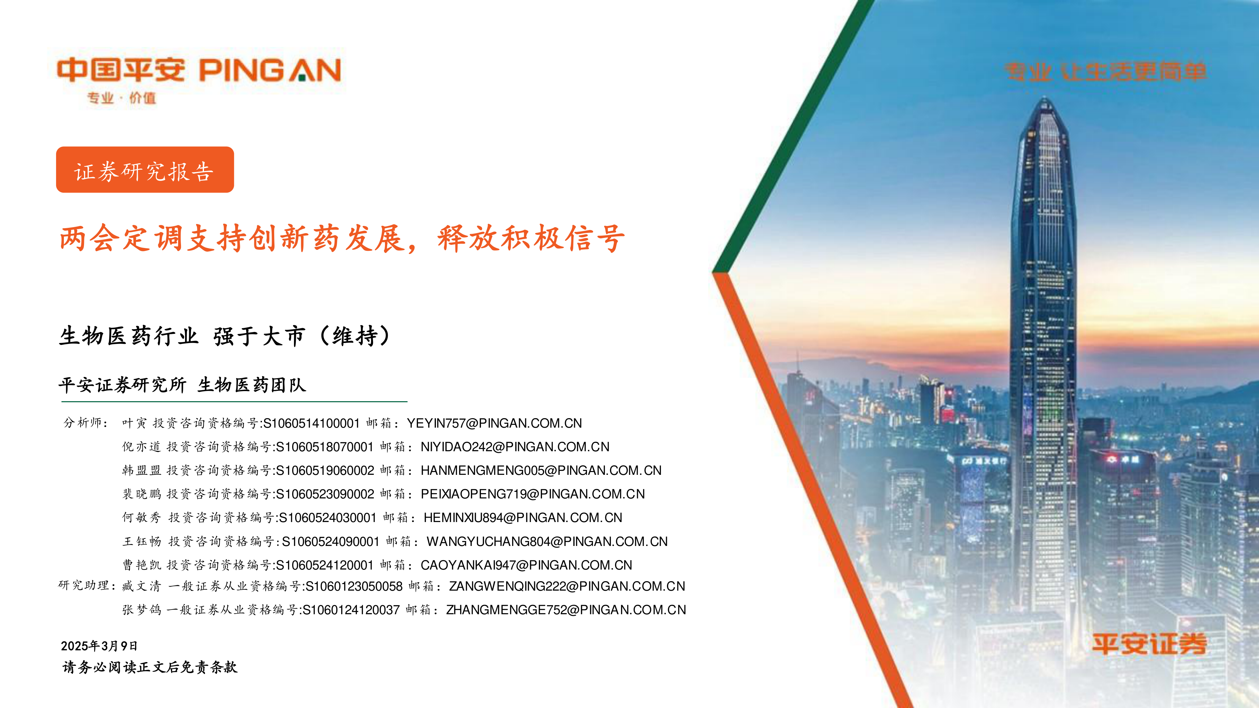 本报告基于2025年两会政府工作报告对创新药产业的积极信号,以及国家对国产基因测序仪的扶持政策,对生物医药行业进行了市场分析和投资建议。报告认为,生物医药行业将呈现强于大市的增长态势,并推荐了多家具有发展潜力的公司。 然而,投资者仍需关注政策风险、研发风险和公司经营风险等因素。 报告中提供的投资建议仅供参考,不构成投资建议,投资者应根据自身情况进行独立判断。