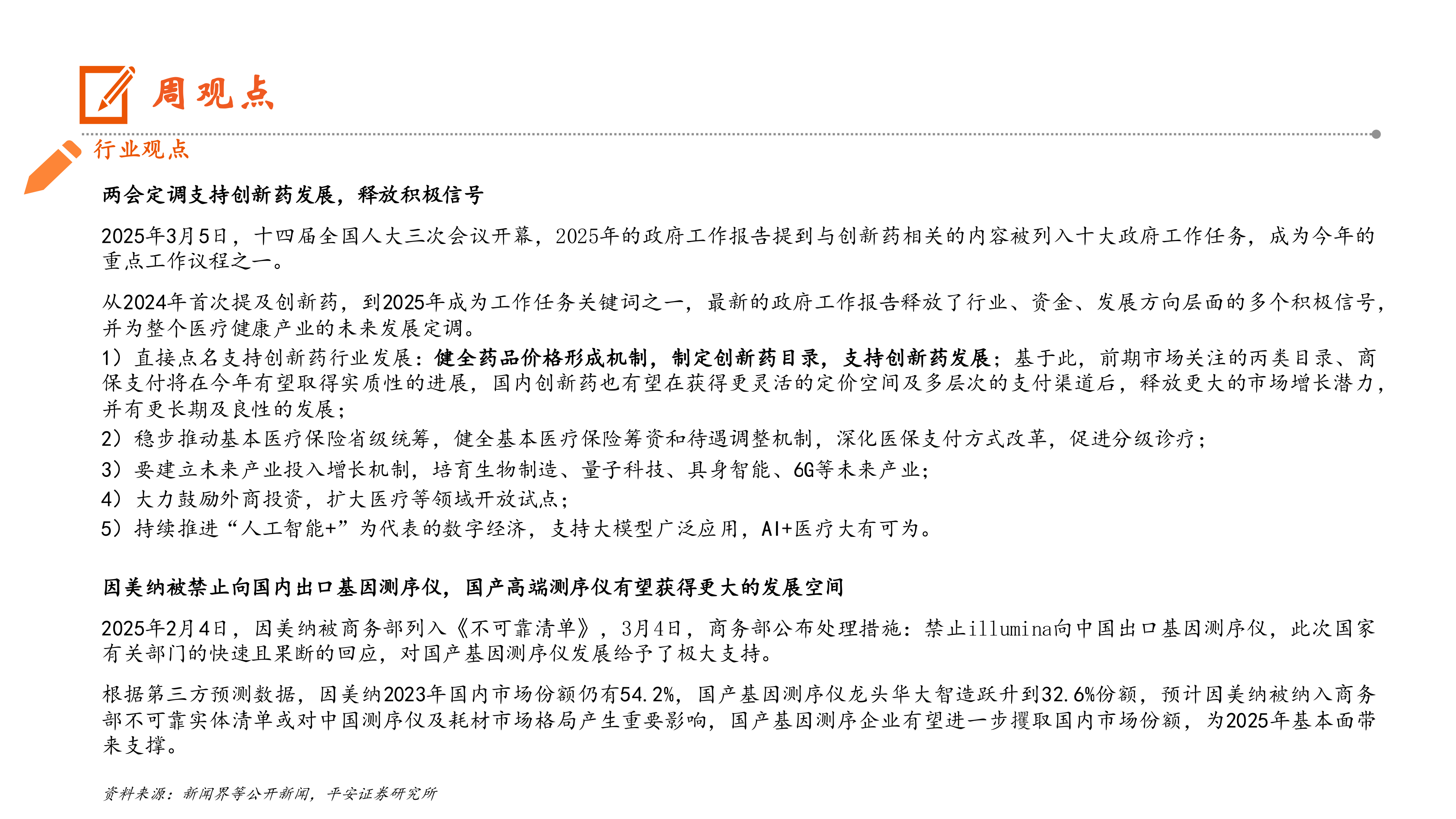2025年3月5日,十四届全国人大三次会议开幕,2025年的政府工作报告提到与创新药相关的内容被列入十大政府工作任务,成为今年的重点工作议程之一。