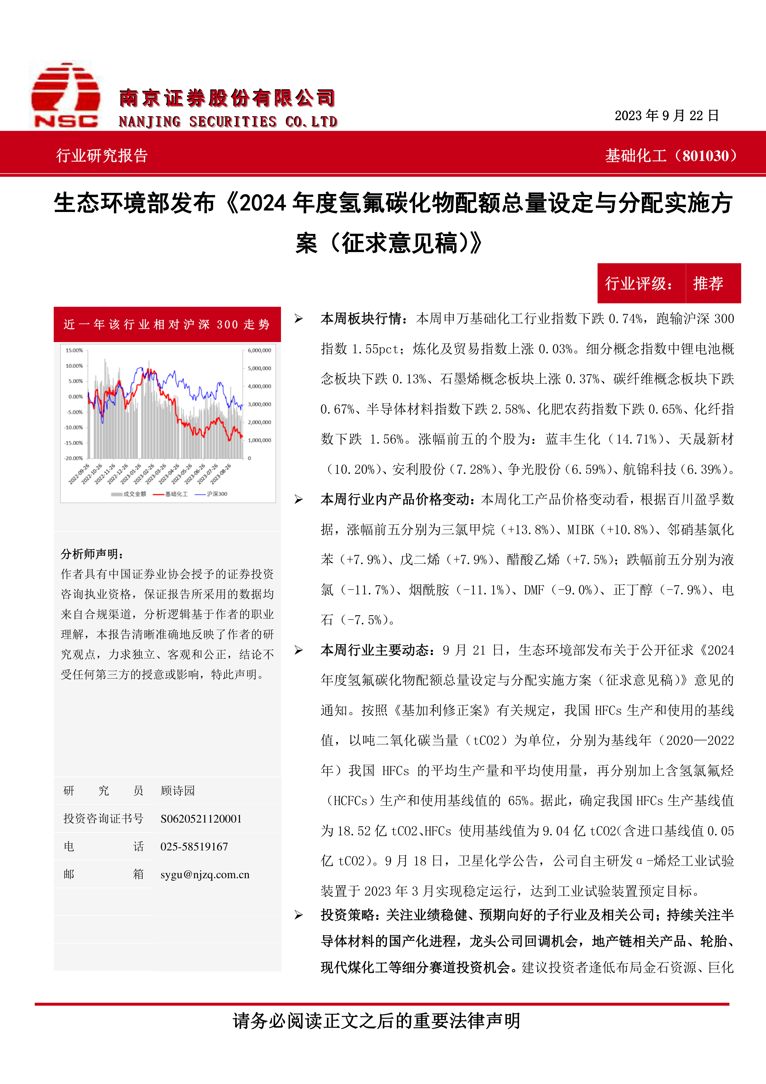 本周行业主要动态:9月21日,生态环境部发布关于公开征求《2024年度氢氟碳化物配额总量设定与分配实施方案(征求意见稿)》意见的通知。按照《基加利修正案》有关规定,我国HFCs生产和使用的基线值,以吨二氧化碳当量(tCO2)为单位,分别为基线年(2020—2022年)我国HFCs的平均生产量和平均使用量,再分别加上含氢氯氟烃(HCFCs)生产和使用基线值的65%。据此,确定我国HFCs生产基线值为18.52亿tCO2、HFCs使用基线值为9.04亿tCO2(含进口基线值0.05亿tCO2)。9月18日,卫星化学公告,公司自主研发α-烯烃工业试验装置于2023年3月实现稳定运行,达到工业试验装置预定目标。