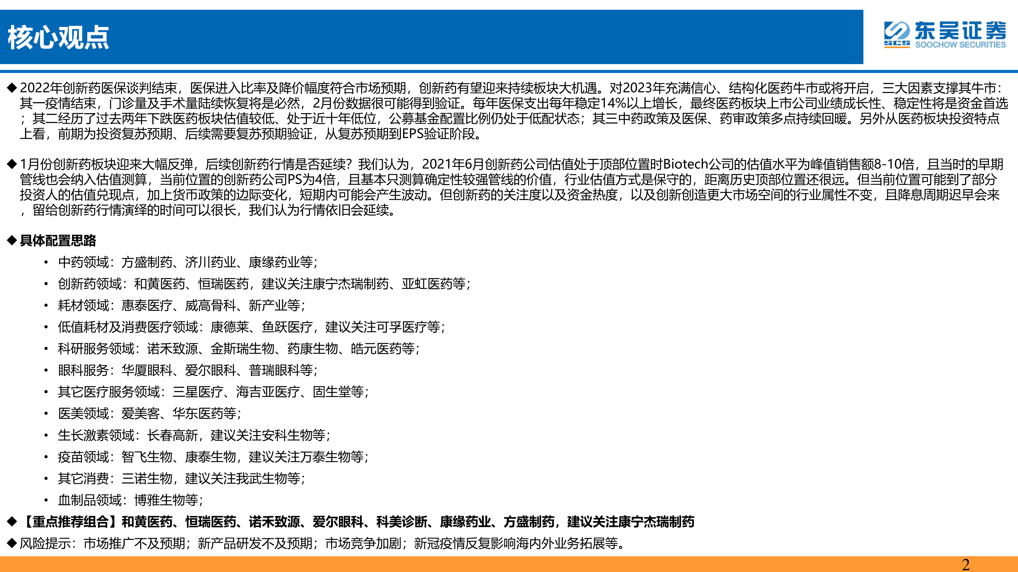 报告总结了2022年医保谈判结果,认为创新药有望迎来持续板块大机遇,并提出了具体的配置思路,涵盖中药、创新药、耗材、低值耗材及消费医疗、科研服务、眼科服务、其他医疗服务、医美、生长激素、疫苗和其他消费、血制品等多个领域。报告重点推荐了和黄医药、恒瑞医药、诺禾致源、爱尔眼科、科美诊断、康缘药业、方盛制药等七个标的,并建议关注康宁杰瑞制药。