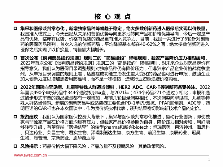 本报告的核心观点是:国家医保谈判和集采常态化,推动医药行业向产品和价格优势导向转变,创新药企面临价格压力,但独家品种降价压力相对缓和。2022年医保谈判向罕见病和儿童用药倾斜,创新药如PD-1单抗/双抗、ADC等备受关注。报告建议关注能够转型升级,有望穿越“医保结界”的创新型药企。