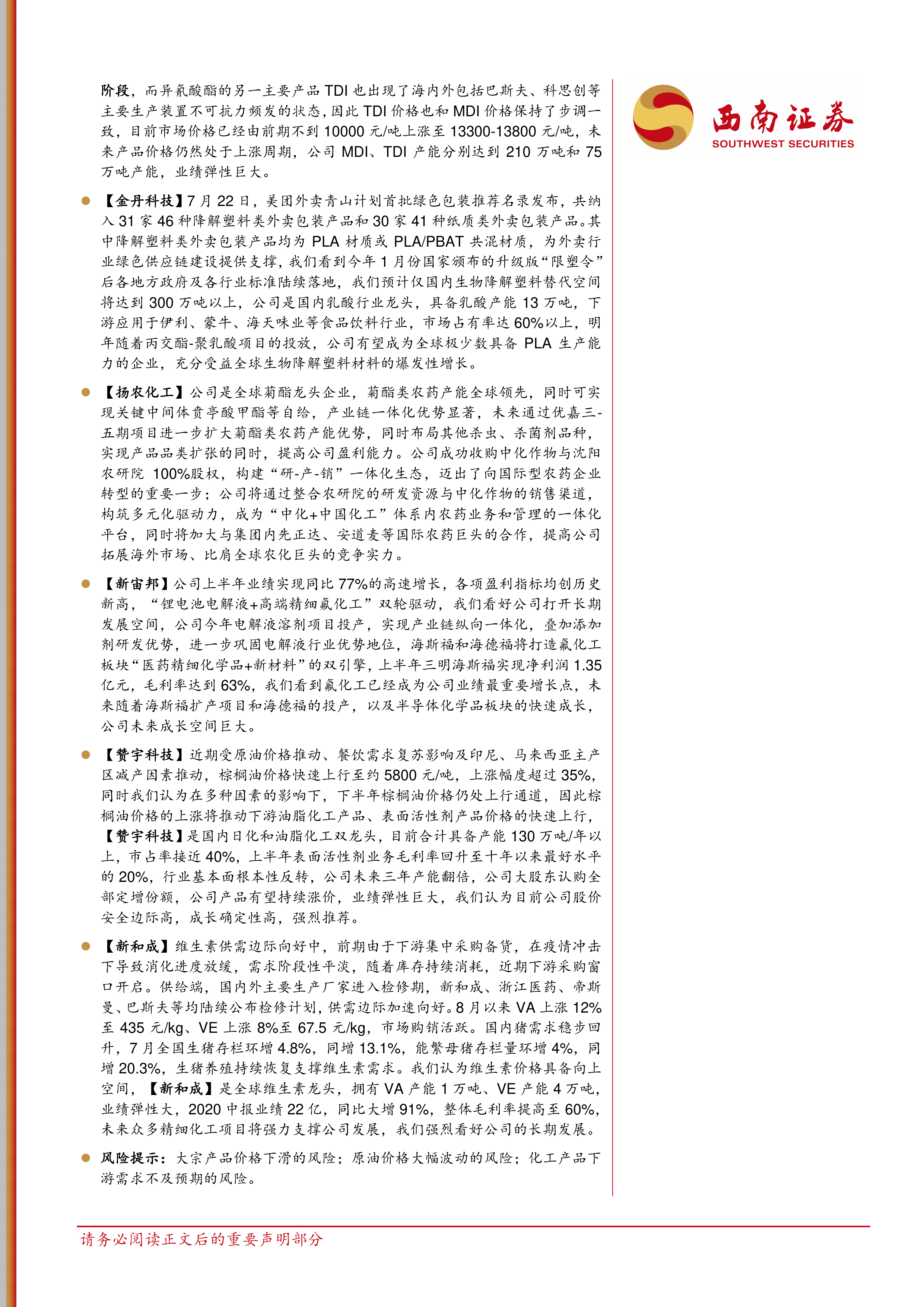 报告对MDI/TDI、维生素、草甘膦、DMF、油脂化工、农药、环氧丙烷、纯碱、生物柴油和碳酸二甲酯等多个化工子板块进行了详细的市场分析,包括价格波动、供需关系、行业竞争格局以及重点公司表现等方面。