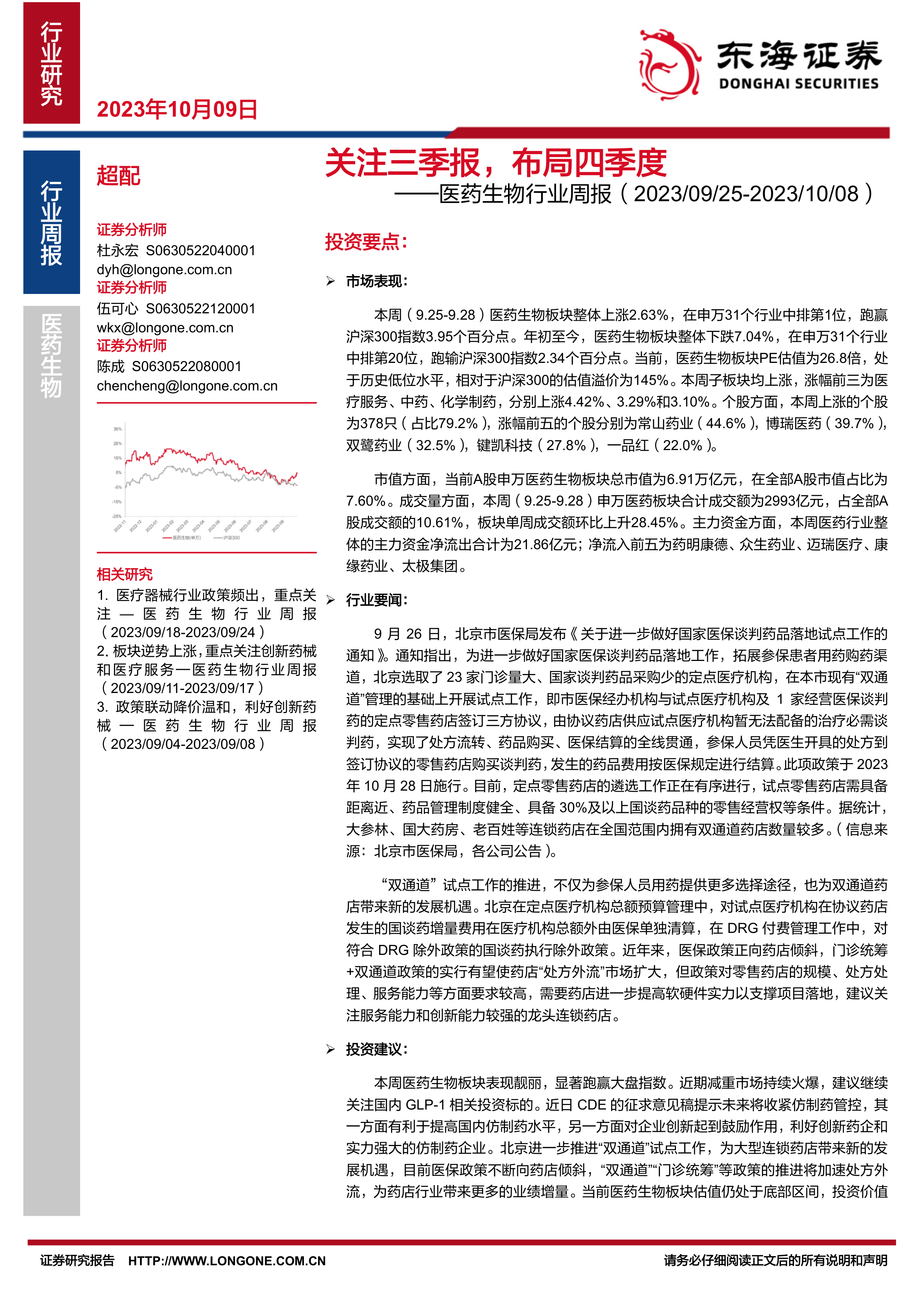 本周医药生物板块表现靓丽,显著跑赢大盘指数。近期减重市场持续火爆,建议继续关注国内GLP-1相关投资标的。近日CDE的征求意见稿提示未来将收紧仿制药管控,其一方面有利于提高国内仿制药水平,另一方面对企业创新起到鼓励作用,利好创新药企和实力强大的仿制药企业。北京进一步推进“双通道”试点工作,为大型连锁药店带来新的发展机遇,目前医保政策不断向药店倾斜,“双通道”“门诊统筹”等政策的推进将加速处方外流,为药店行业带来更多的业绩增量。当前医药生物板块估值仍处于底部区间,投资价值显著,建议结合三季报业绩披露情况,积极布局年末投资机会。建议关注创新药、特色器械、连锁药店、服务外包、民营医院、二类疫苗等细分板块及个股。