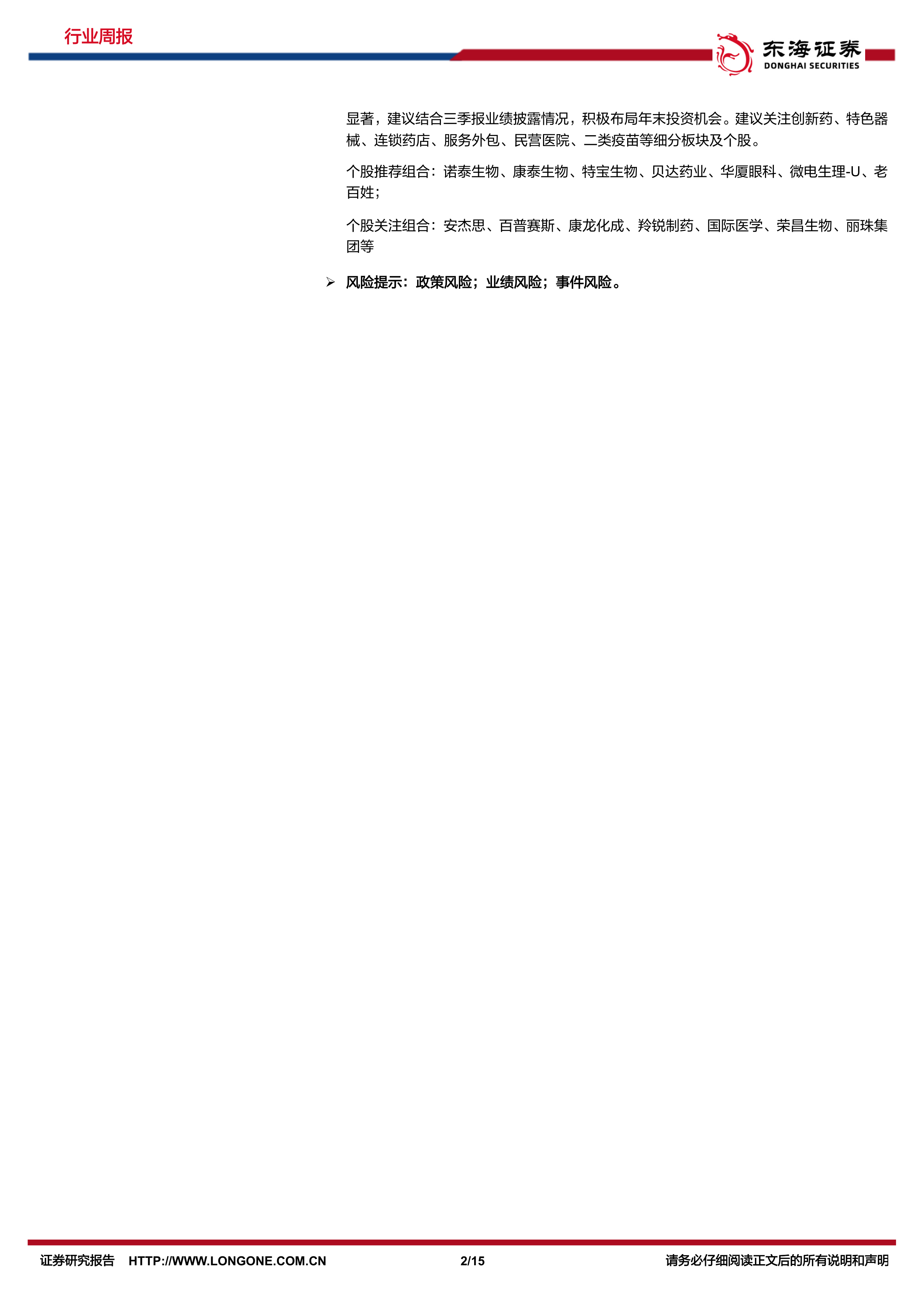 报告基于市场表现和政策分析,提出了具体的投资建议,建议关注创新药、特色器械、连锁药店、服务外包、民营医院、二类疫苗等细分板块及个股,并提供了具体的个股推荐组合和关注组合。 同时,报告也明确指出了政策风险、业绩风险和事件风险等潜在风险,提醒投资者谨慎投资。