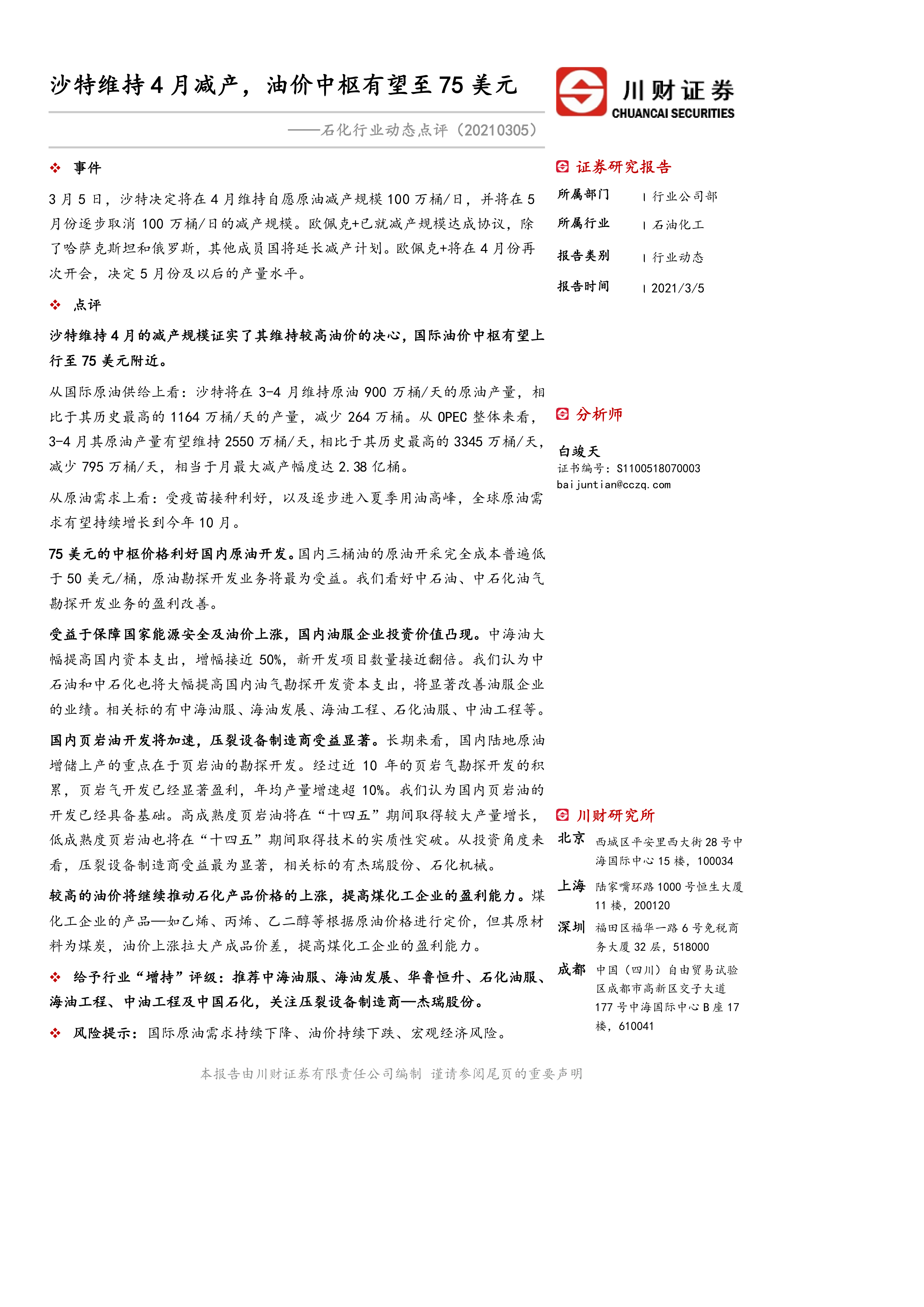 本报告是一份石化行业动态点评,主要分析了沙特维持4月减产对国际油价及国内石化行业的影响。