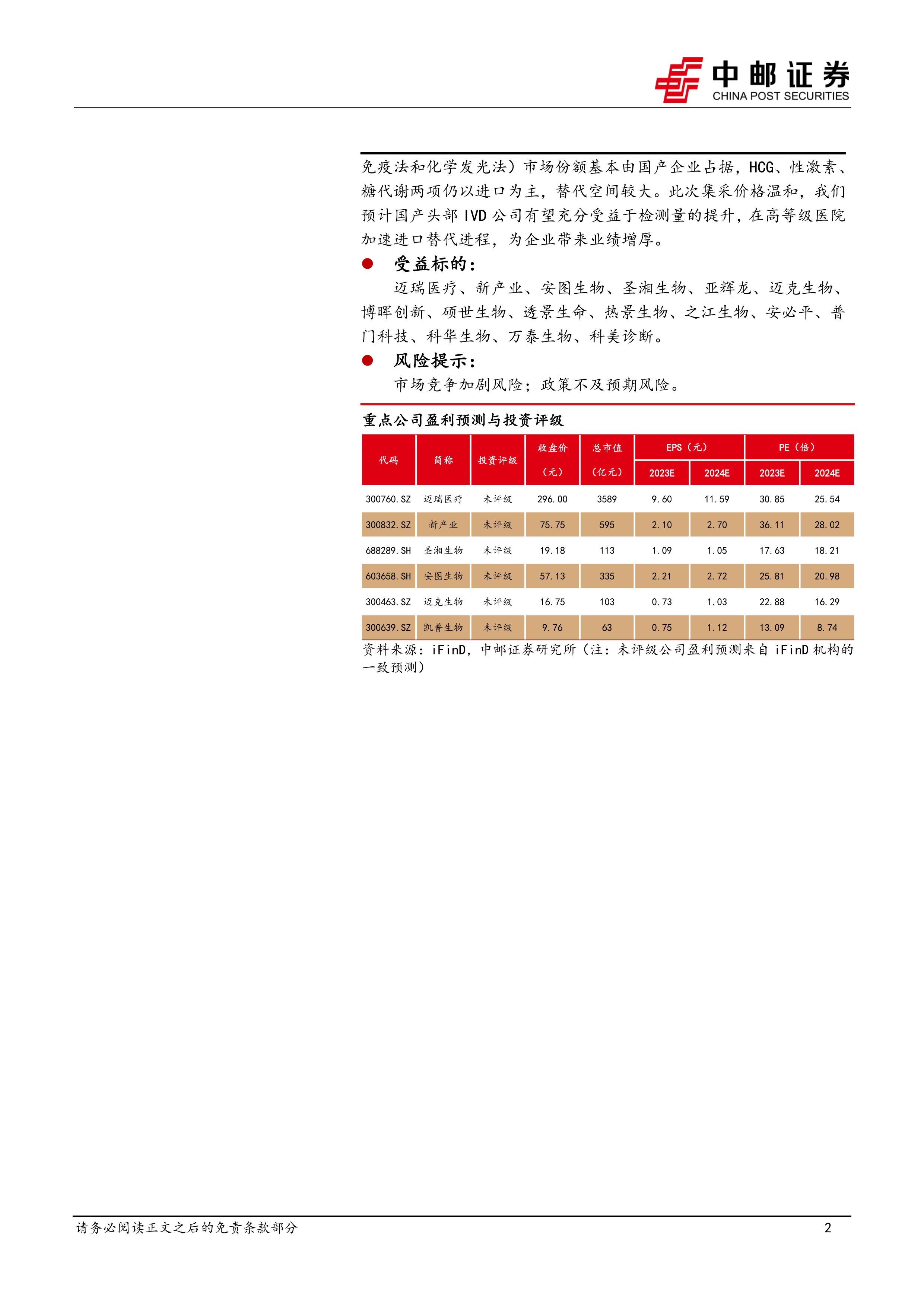 报告列出了预计将受益于此次集采的企业,包括迈瑞医疗、新产业、安图生物、圣湘生物等,并提示了市场竞争加剧风险和政策不及预期风险。